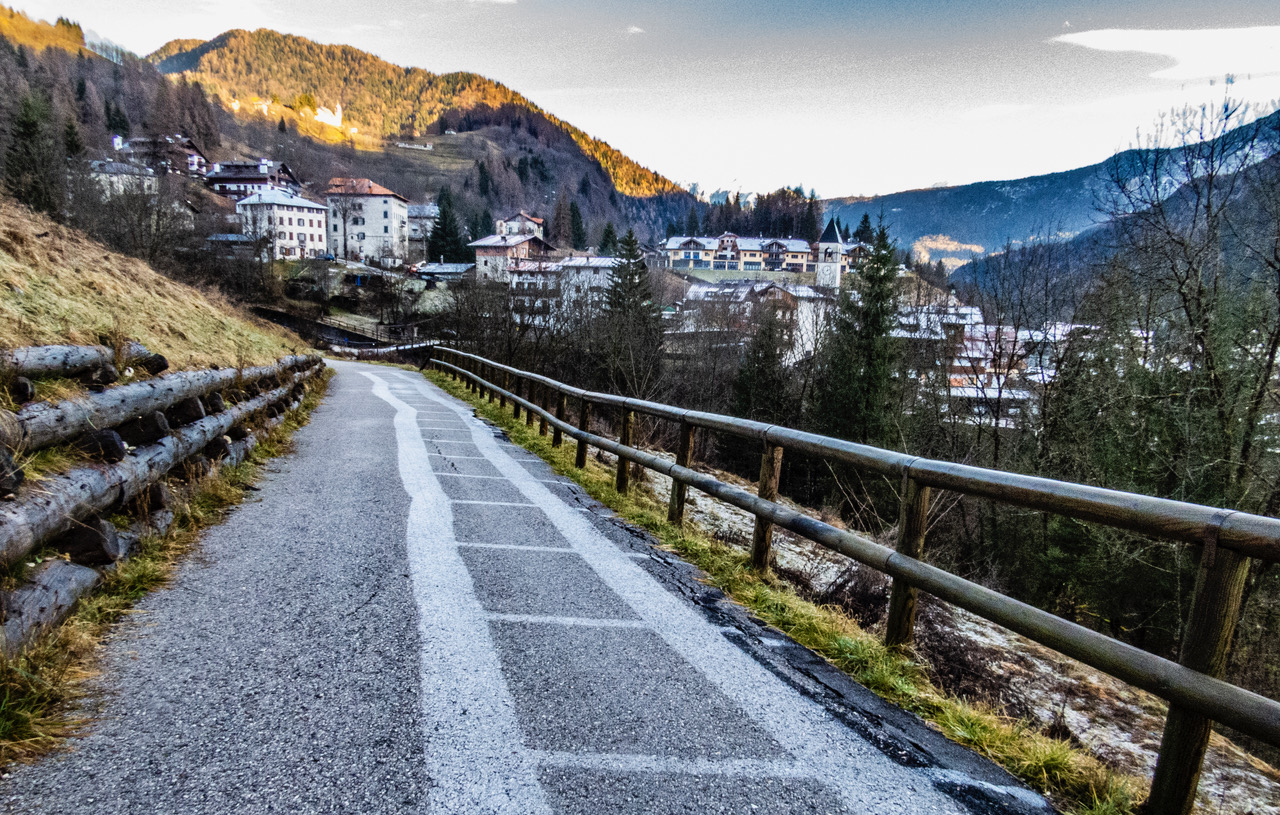 Explanation: The word solstice is from the Latin for Sun and to pause or stand still. And in the days surrounding a solstice the Sun's annual north-south drift in planet Earth's sky does slow down, pause, and then reverse direction. So near the solstice the daily path of the Sun through the sky really doesn't change much. In fact, near the December solstice, the Sun's consistent, low arc through northern hemisphere skies, along with low surface temperatures, has left a noticeable imprint on this path to the mountain town of Peaio in northern Italy. The morning frost on the road has melted away only where the sunlight was able to reach the ground. But it remains in the areas persistently shadowed by the fence, tattooing in frost an image of the fence on the asphalt surface.