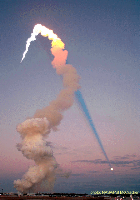 Explanation: Why would the shadow of a space shuttle launch plume point toward the Moon? Two weeks ago during the launch of Atlantis, the Sun, Earth, Moon, and rocket were all properly aligned for this photogenic coincidence. First, for the space shuttle's plume to cast a long shadow, the time of day must be either near sunrise or sunset. Next, just at sunset, the shadow is the longest and extends all the way to the horizon. Finally, during a Full Moon, the Sun and Moon are on opposite sides of the sky. Just after sunset, for example, the Sun is slightly below the horizon, and, in the other direction, the Moon is slightly above the horizon. Therefore, as Atlantis blasted off, just after sunset, its shadow projected away from the Sun toward the opposite horizon, where the Full Moon just happened to be. |