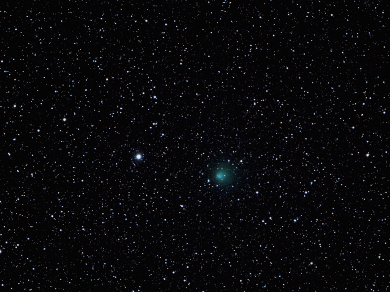 Explanation: It's back. Every 3.3 years, Comet Encke swoops back into our inner Solar System. First officially discovered in 1786, Comet Encke is on its 59 th documented return, making it one of the best-studied comets on the sky. Mysteriously, Comet Encke should have been discovered millennia earlier, since it likely became bright enough to see unaided many times over the past few thousand years. Comet Encke's elliptical trajectory reaches from outside the orbit of Mars to inside the orbit of Mercury. It passed relatively close to the Earth on Nov. 17 and will reach its closest to the Sun on Dec 29. Recent observations place Comet Encke as bright as visual magnitude six during early December, making it just on the verge of unaided human vision. Pictured above, the diffuse smudge of periodic Comet Encke was imaged through a small telescope on November 29 from Arkansas, USA.