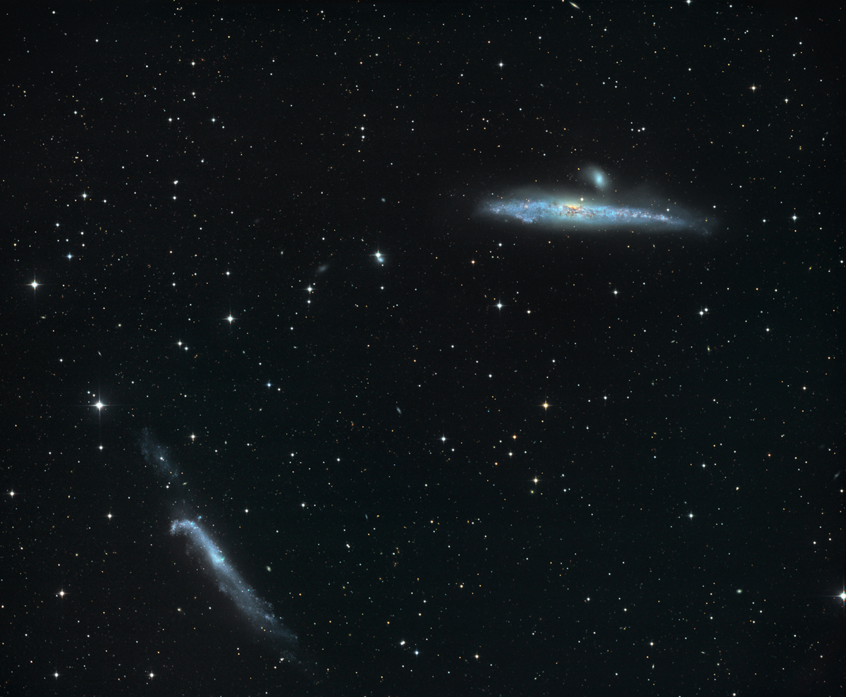 Explanation: NGC 4631 is a big beautiful spiral galaxy seen edge-on (top right) only 25 million light-years away towards the small northern constellation Canes Venatici. This galaxy's slightly distorted wedge shape suggests to some a cosmic herring and to others the popular moniker of The Whale Galaxy. Either way, it is similar in size to our own Milky Way. In this gorgeous colour image, the Whale's dark interstellar dust clouds, yellowish core, and young blue star clusters are easy to spot. A companion galaxy, the small elliptical NGC 4627, appears above the Whale Galaxy. At the lower left is another distorted galaxy, the hockey stick-shaped NGC 4656. The distortions and mingling trails of gas detected at other wavelengths suggest that all three galaxies have had close encounters with each other in their past. The Whale Galaxy is also known to have spouted a halo of hot gas glowing in x-rays.