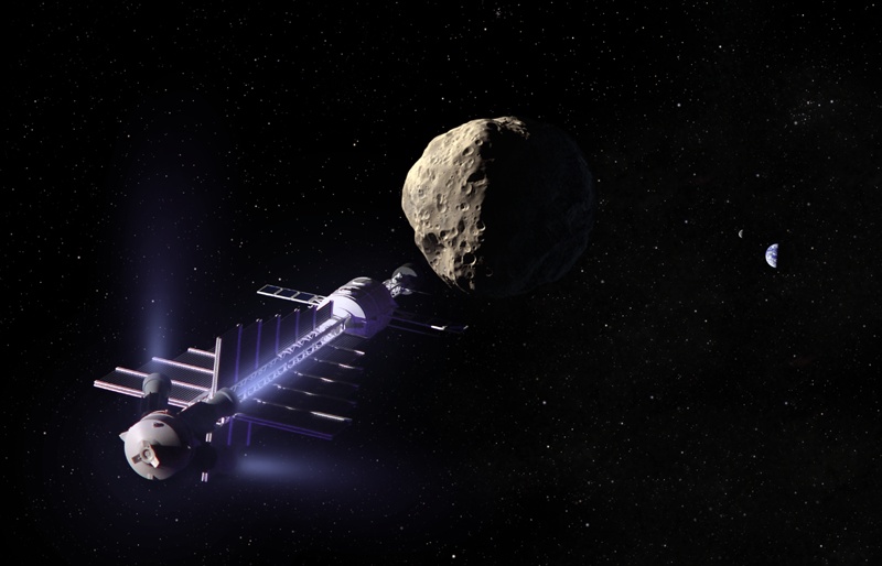 Explanation: How would you change the course of an Earth-threatening asteroid? One idea - a massive spacecraft that uses gravity as a towline - is illustrated in this dramatic artist's view of a gravitational tractor in action. In the hypothetical scenario worked out in 2005 by Edward Lu and Stanley Love at NASA's Johnson Space Centre, a 20 ton nuclear-electric spacecraft tows a 200 metre diameter asteroid by simply hovering near the asteroid. The spacecraft's ion drive thrusters are canted away from the surface. The steady thrust would gradually and predictably alter the course of the tug and asteroid, coupled by their mutual gravitational attraction. While it sounds like the stuff of science fiction, ion drives do power existing spacecraft and a gravitational tractor would work regardless of the asteroid's structure or surface properties.