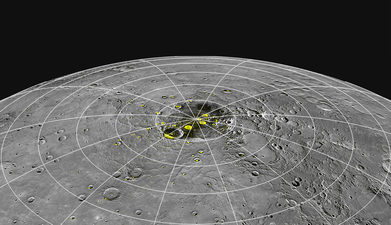Explanation: Innermost planet Mercury would probably not be a good location for an interplanetary winter olympics. But new results based on data from the Mercury orbiting MESSENGER spacecraft indicate that it does have substantial water ice in permanently shadowed regions within craters near its north pole. The possibility of ice on Mercury has been entertained for years, inspired by the discovery of radar bright, hence highly reflective, regions near the north pole. Highlighted in yellow in this map based on projected MESSENGER images, radar bright regions are seen to correspond with floors and walls of north polar impact craters. Farther from the pole the regions are concentrated on the north facing crater walls. MESSENGER's neutron spectroscopy and thermal models for the craters indicate material in these regions has a hydrogen content consistent with nearly pure water ice and is trapped in an area with temperatures that remain below 100 kelvins (-280 deg.F, -173 deg.C). In circumstances similar to permanent shadows in craters of the Moon, debris from comet impacts is thought to be the source of ice on Mercury.