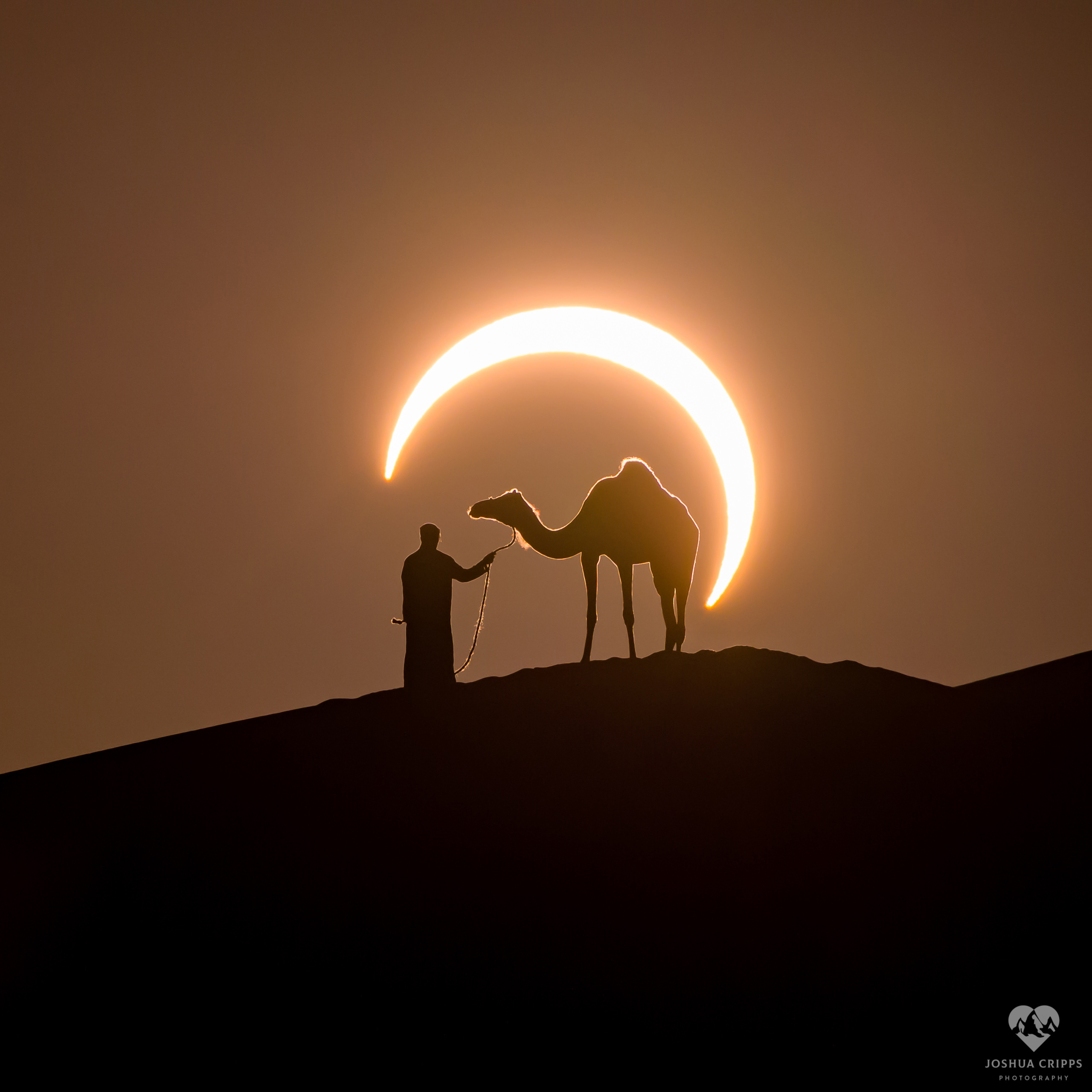 Explanation: What's happening behind that camel? A partial eclipse of the Sun. About six and a half weeks ago, the Moon passed completely in front of the Sun as seen from a narrow band on the Earth. Despite (surely) many camels being located in this narrow band, only one found itself stationed between this camera, the distant Moon, and the even more distant Sun. To create this impressive superposition, though, took a well-planned trip to the United Arab Emirates, careful alignments, and accurate timings on the day of the eclipse. Although the resulting featured image shows a partially eclipsed Sun rising, the Moon went on to appear completely engulfed by the Sun in an annular eclipse known as a ring of fire. Forward scattering of sunlight, dominated by quantum mechanical diffraction, gives the camel hair and rope fray an unusual glow. The next solar eclipse is also an annular eclipse and will occur this coming June.