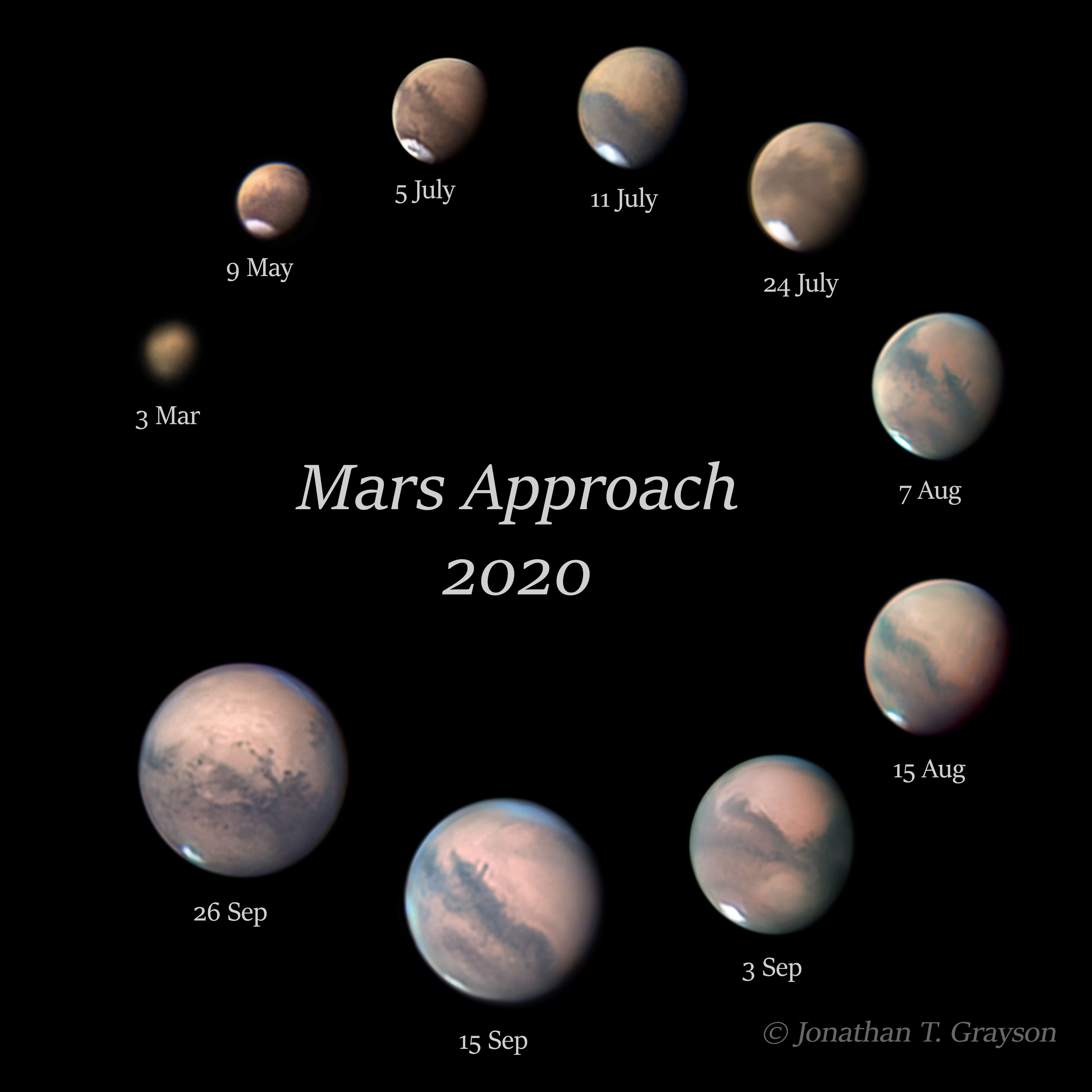 Explanation: Look to the east just after sunset tonight and you'll see a most impressive Mars. Tonight, Mars will appear its biggest and brightest of the year, as Earth passes closer to the red planet than it has in over two years -- and will be again for another two years. In a week, Mars will be almost as bright -- but at opposition, meaning that it will be directly opposite the Sun. Due to the slightly oval shape of the orbits of Mars and Earth, closest approach and opposition occur on slightly different days. The featured image sequence shows how the angular size of Mars has grown during its approach over the past few months. Noticeably orange, Mars is now visible nearly all night long, reflecting more sunlight toward Earth than either Saturn or Jupiter. Even at its closest and largest, though, Mars will still appear about 100 times smaller, in diameter, than a full moon.