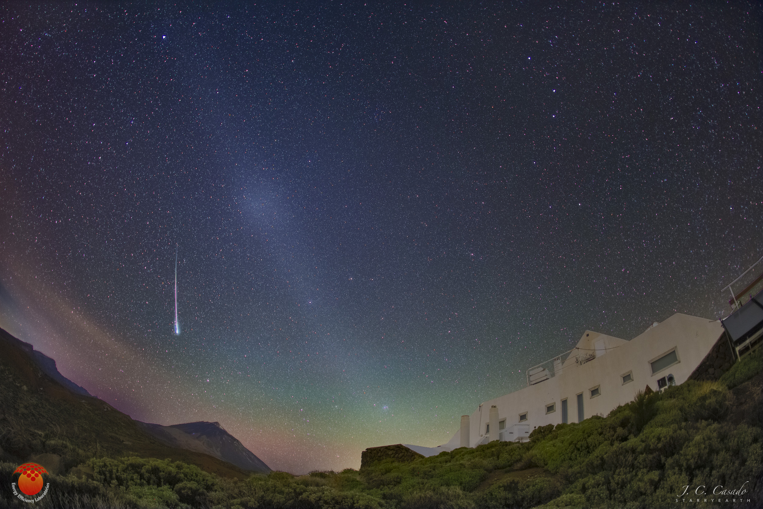 Explanation: Is the night sky darkest in the direction opposite the Sun? No. In fact, a rarely discernable faint glow known as the gegenschein (German for "counter glow") can be seen 180 degrees around from the Sun in an extremely dark sky. The gegenschein is sunlight back-scattered off small interplanetary dust particles. These dust particles are millimetre sized splinters from asteroids and orbit in the ecliptic plane of the planets. Pictured here from last March is one of the more spectacular pictures of the gegenschein yet taken. The deep exposure of an extremely dark sky over Teide Observatory in Spain's Canary Islands shows the gegenschein as part of extended zodiacal light. Notable background objects include a bright meteor (on the left), the Big Dipper (top right), and Polaris (far right). The meteor nearly points toward Mount Teide, Spain's highest mountain, while the Pyramid solar laboratory is visible on the right. During the day, a phenomenon like the gegenschein called the glory can be seen in reflecting air or clouds opposite the Sun from an airplane.