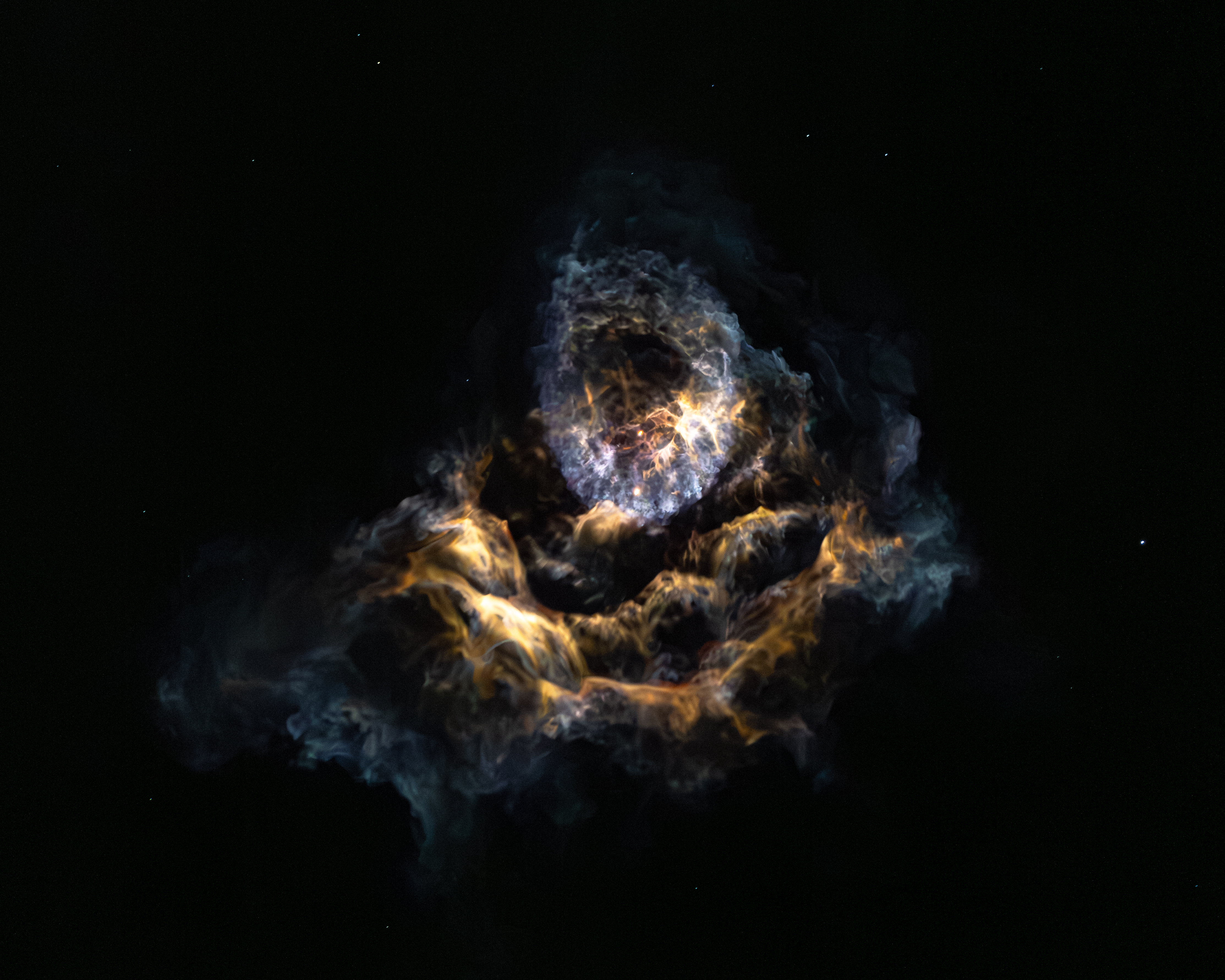 Explanation: Not the James Webb Space Telescope's latest view of a distant galactic nebula, this illuminated cloud of gas and dust dazzled early morning spacecoast skygazers on August 26. The snapshot was taken about 2 minutes after the launch of a Falcon 9 rocket on the SpaceX Crew-7 mission, the seventh commercial crew rotation mission for the International Space Station. It captures drifting plumes and exhaust from the separated first and second stage illuminated against the still dark skies. Near the centre of the image, within the ragged blueish ring, are two bright points of light. The lower one is the second stage of the rocket carrying 4 humans to space in a Crew Dragon spacecraft. The bright point above is the Falcon 9 first stage booster orienting itself for the trip back to Landing Zone-1 at Cape Canaveral, planet Earth.