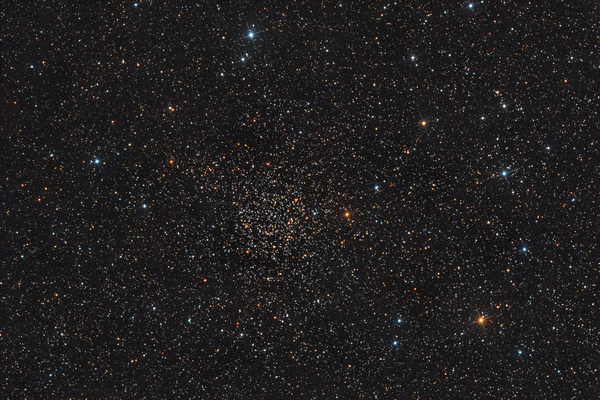 Explanation: Found among the rich starfields of the Milky Way, star cluster NGC 7789 lies about 8,000 light-years away toward the constellation Cassiopeia. A late 18th century deep sky discovery of astronomer Caroline Lucretia Herschel, the cluster is also known as Caroline's Rose. Its visual appearance in small telescopes, created by the cluster's complex of stars and voids, is suggestive of nested rose petals. Now estimated to be 1.6 billion years young, the galactic or open cluster of stars also shows its age. All the stars in the cluster were likely born at the same time, but the brighter and more massive ones have more rapidly exhausted the hydrogen fuel in their cores. These have evolved from main sequence stars like the Sun into the many red giant stars shown with a yellowish cast in this colour composite. Using measured colour and brightness, astronomers can model the mass and hence the age of the cluster stars just starting to "turn off" the main sequence and become red giants. Over 50 light-years across, Caroline's Rose spans about half a degree (the angular size of the Moon) near the centre of the sharp telescopic image.