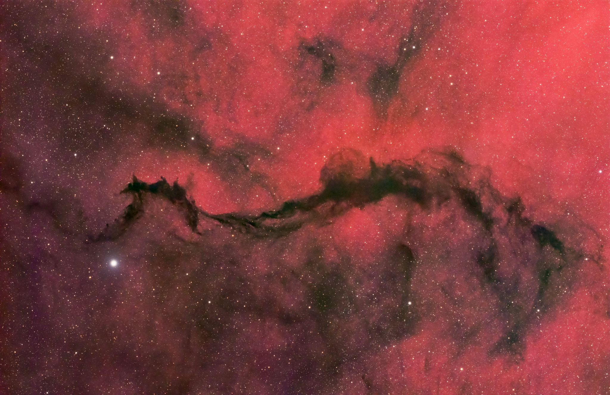Explanation: The diffuse hydrogen-alpha glow of emission region Sh2-27 fills this cosmic scene. The field of view spans nearly 3 degrees across the nebula-rich constellation Ophiuchus toward the central Milky Way. A Dark Veil of wispy interstellar dust clouds draped across the foreground is chiefly identified as LDN 234 and LDN 204 from the 1962 Catalog of Dark Nebulae by American astronomer Beverly Lynds. Sh2-27 itself is the large but faint HII region surrounding runaway O-type star Zeta Ophiuchi. Along with the Zeta Oph HII region, LDN 234 and LDN 204 are likely 500 or so light-years away. At that distance, this telescopic frame would be about 25 light-years wide.