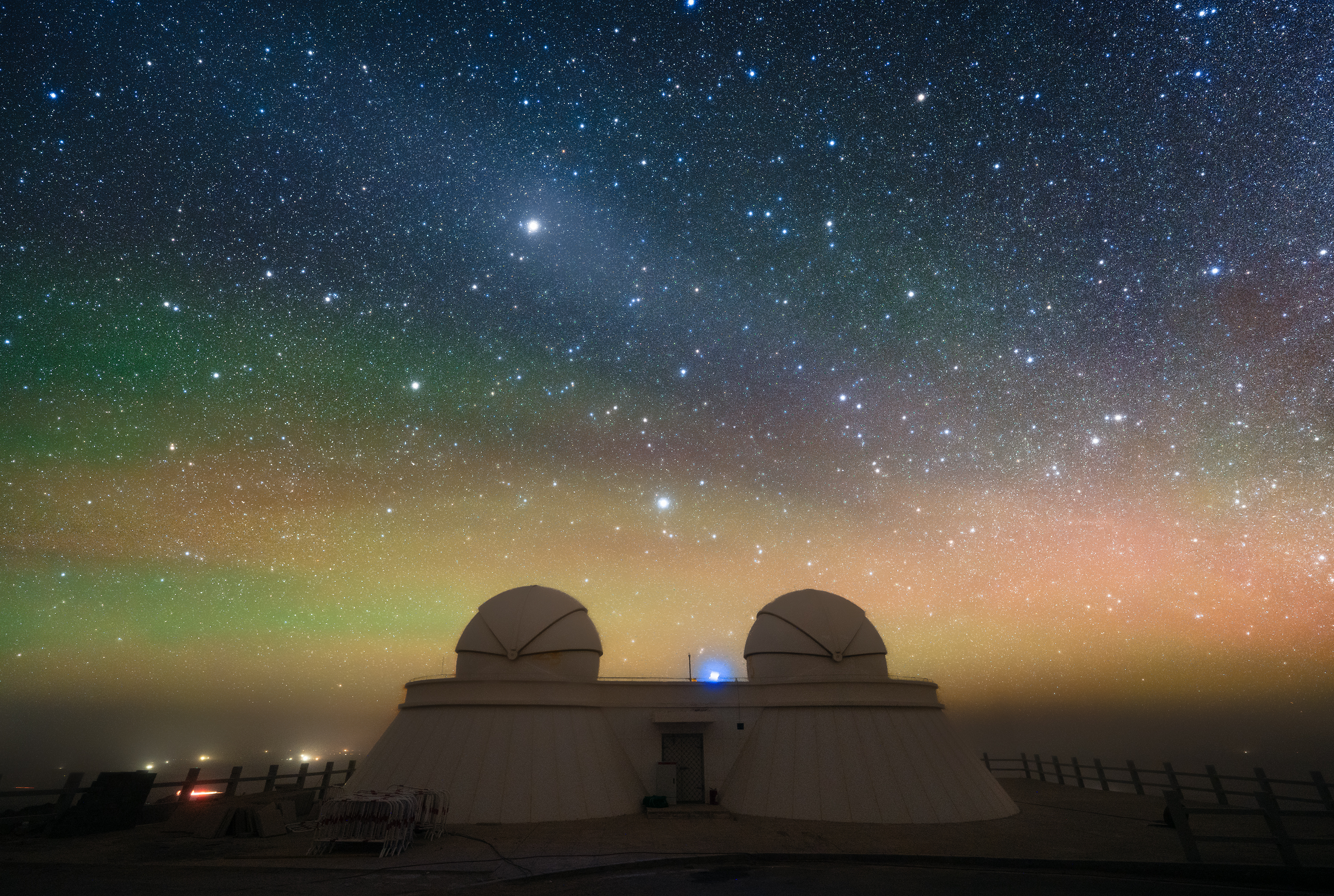 Explanation: This year Saturn was at opposition on September 21, opposite the Sun in planet Earth's sky. At its closest to Earth, Saturn was also at its brightest of the year, rising as the Sun set and shining above the horizon all night long among the fainter stars of the constellation Pisces. In this snapshot from the Qinghai Lenghu Observatory, Tibetan Plateau, southwestern China, the outer planet is immersed in a faint, diffuse oval of light known as the gegenschein or counter glow. The diffuse gegenschein is produced by sunlight backscattered by interplanetary dust along the Solar System's ecliptic plane, opposite the Sun in planet Earth's sky. Like a giant eye, on this dark night Saturn and gegenschein seem to stare down on the observatory's telescope domes from their antisolar perspective. Strong atmospheric airglow forms a colourful background along the horizon.