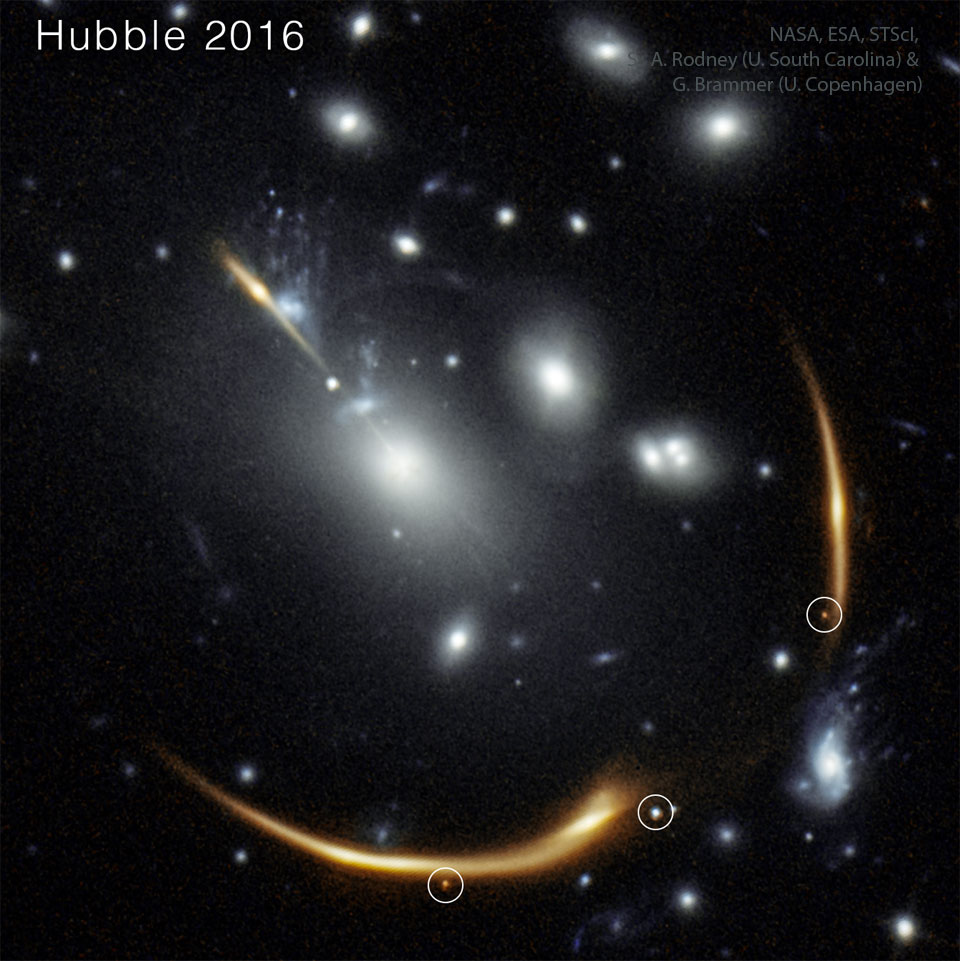 Explanation: Now a second supernova in this same galaxy is repeating. The cause is the gravitational lens effect of a massive foreground cluster of galaxies (MACS J0138) -- it creates multiple images of a perfectly aligned background galaxy (MRG-M0138). What's particularly interesting is that this background galaxy has young stars that keep blowing up. And images of each supernova explosion keep coming to us multiple times through different paths through the cluster. The original lensed supernova set, shown in the rollover, is called Requiem and was first seen by the Hubble Space Telescope in 2016. This second lensed supernova set is called Encore and was first seen by the Webb Space Telescope in 2023. More images from these supernovae are predicted to be on the way, and exactly when they arrive should help humanity to better understand the mass distribution of the galaxy cluster, the supernovae themselves, and possibly even the universe.