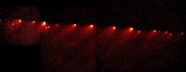 Explanation: Comet Shoemaker-Levy 9, named after its co-discoverers, was often referred to as the "string of pearls" comet. It is famous for its unusual appearance as well as its collision with the planet Jupiter! The comet's original single nucleus was torn to pieces by Jupiter's strong gravity during a close encounter with the solar system's largest planet in 1992. The pieces are seen in this composite of Hubble Space Telescope images to be "pearls" strung out along the comet's orbital path. In July of 1994 these pieces collided with Jupiter in a rare and spectacular series of events.