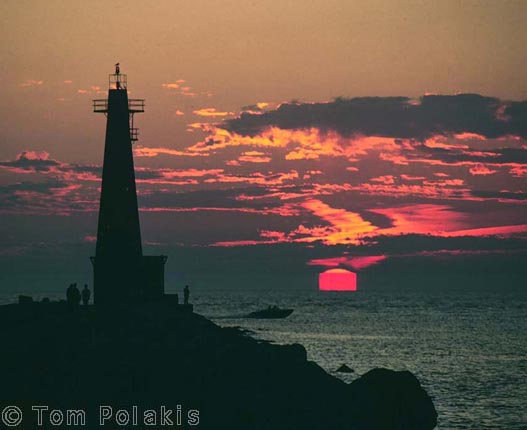 Explanation: Isn't the Sun round? Yes, but in the above picture, the Earth's atmosphere makes it appear almost square. Here a layer of air near the Earth was so warm it acted like a giant lens, creating increasingly distorted paths for sunlight to reach the camera. Similarly, on a long flat highway, it may appear that the road in the distance is covered with water. In this case, light from the blue sky is being unusually refracted by warm air just above the dry road. No matter how the Earth's atmosphere makes the Sun appear, the Sun will always be spherical. This setting Sun was photographed over Lake Michigan in Muskegon, MI.
