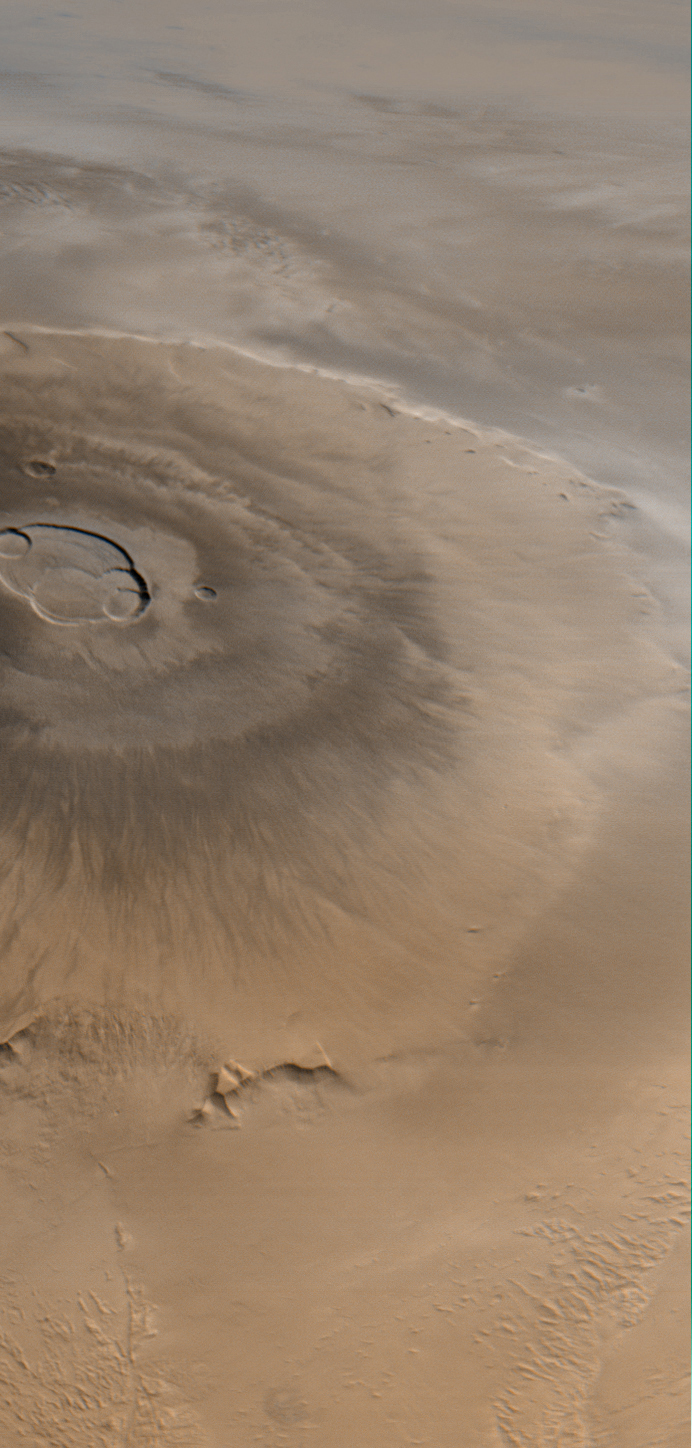 Explanation: Olympus Mons on Mars is the largest volcano in the Solar System. Although three times higher than Earth's Mount Everest, Olympus Mons would not be difficult to climb because of the volcano's great breadth. Covering an area greater than the entire Hawaiian volcano chain, the slopes of Olympus Mons typically rise only a few degrees at a time. The low gravity of Mars combined with a relatively static surface crust allow volcanoes this large to build up over time. This representative-colour image was taken last April by the Mars Global Surveyor spacecraft currently orbiting Mars. |