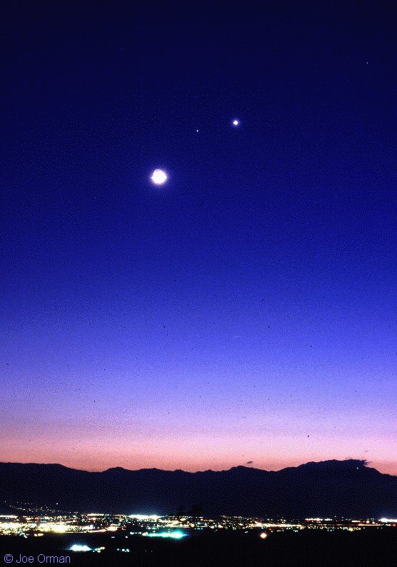 Explanation: The Moon, Saturn, and Venus shine above while city lights twinkle below in the deepening twilight of March 19. Taken from outside Indio, California, the photo shows the city lights of Indio and nearby Palm Springs. The brilliant lunar crescent is over exposed here with Saturn about 4 degrees away to the upper right and bright Venus still farther to the right only another 2 degrees or so. This Sunday evening, April 18, another dramatic lunar spectacle should be easily visible to stargazers in the western and midwestern US when the crescent moon passes in front of the bright star Aldebaran.