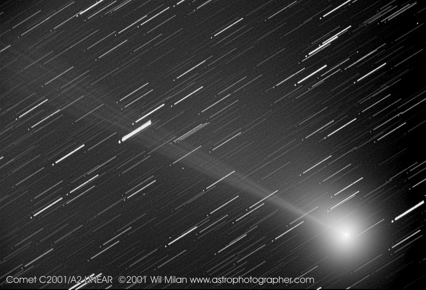Explanation: Comet C/2001 A2 (LINEAR) has crossed the celestial equator and is heading north. Outward bound, this primordial piece of the solar system is still just visible to the unaided eye and can now be sighted by northern hemisphere skygazers as it moves through the constellation Pisces. This picture of the comet is a combination of 33 individual one minute exposures made on June 30 with a small telescope and digital camera situated in central Arizona, USA. The composite image brings out faint details in the comet's tail which was reported to extend for several degrees, beyond the camera's roughly 2 degree field of view. Closely spaced, the combined exposures were registered on the comet so background stars appear trailed. To produce the "punctuation" at the end of each star trail, two exposures near the end of the sequence were left out. As a result, the final dots nicely reveal the pattern of the background star field.