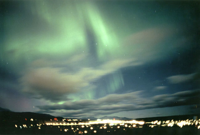 Explanation: Last week was another good week for aurorae. The story began about two weeks ago when two large Coronal Mass Ejections exploded off the Sun. Waves of elementary particles and ions swept out past the Earth on September 28 and 29, causing many aurorae. A week ago, a flapping sheet that divides north and south regions of the Sun's magnetic field passed the Earth, again causing aurorae. Pictured above is a particularly good image of one of the October 1 northern lights. Taken in Canada's Yukon, the city lights of Whitehorse are seen below dark clouds and a twisting green aurora.