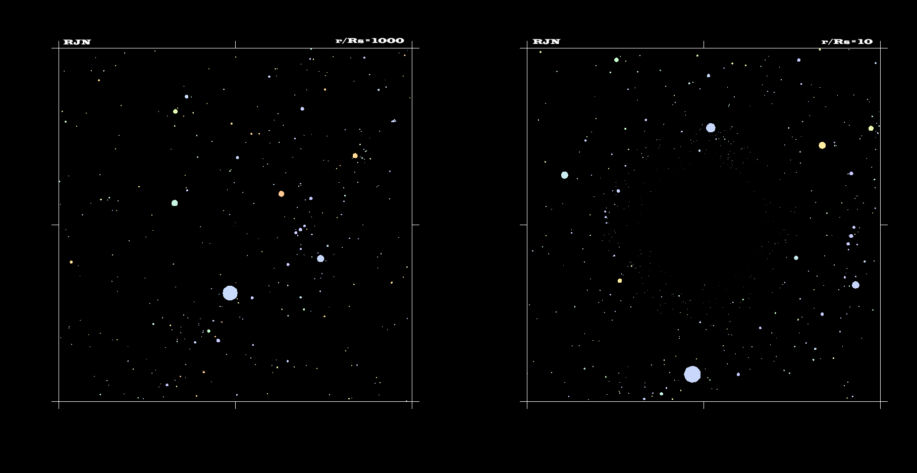 Explanation: What would you see if you went right up to a black hole? Above are two computer generated images highlighting how strange things would look. On the left is a normal star field containing the constellation Orion. Notice the three stars of nearly equal brightness that make up Orion's Belt. On the right is the same star field but this time with a black hole superposed in the centre of the frame. The black hole has such strong gravity that light is noticeably bent towards it - causing some very unusual visual distortions. In the distorted frame, every star in the normal frame has at least two bright images - one on each side of the black hole. In fact, near the black hole, you can see the whole sky - light from every direction is bent around and comes back to you. Black holes are thought to be the densest state of matter, and there is indirect evidence for their presence in stellar binary systems and the centres of globular clusters, galaxies, and quasars.