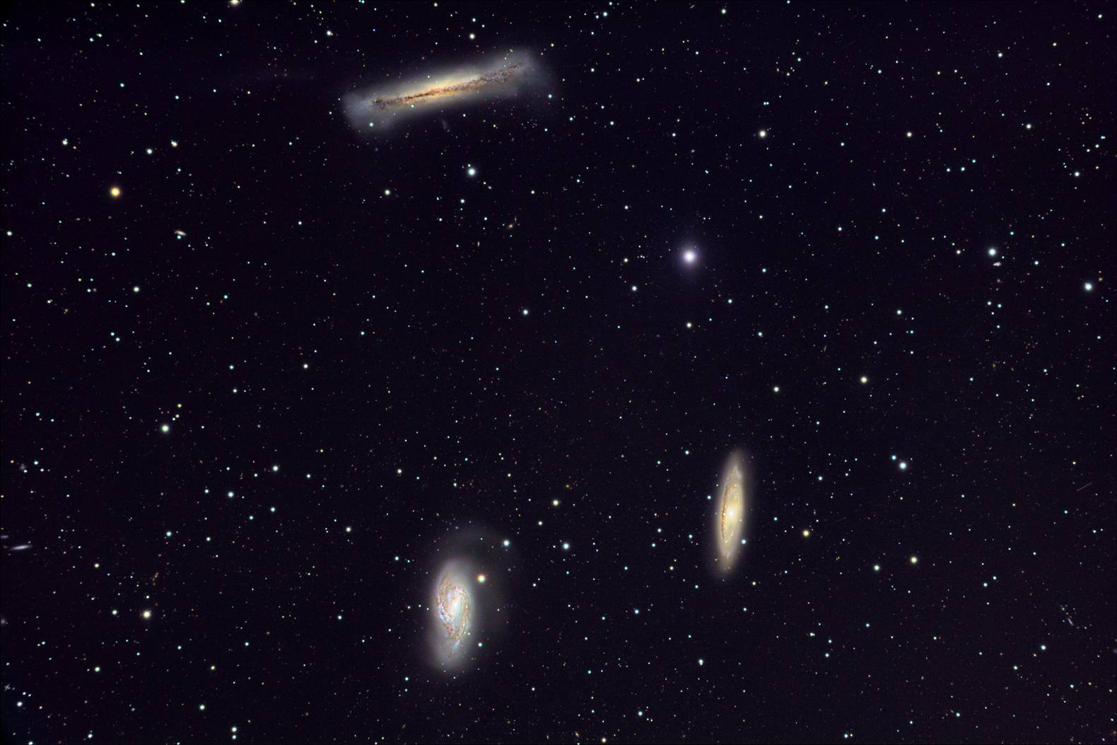 Explanation: This popular group is famous as the Leo Triplet - a gathering of three magnificent galaxies in one field of view. Crowd pleasers when imaged with even modest telescopes, these galaxies can be introduced individually as NGC 3628 (top), M66 (bottom left), and M65 (bottom right). All three are large spiral galaxies. They tend to look dissimilar because their galactic disks are tilted at different angles to our line of sight. NGC 3628 is seen edge-on, with obscuring dust lanes cutting across the plane of the galaxy, while the disks of M66 and M65 are both inclined enough to show off their spiral structure. Gravitational interactions between galaxies in the group have also left telltale signs, including the warped and inflated disk of NGC 3628 and the drawn out spiral arms of M66. This gorgeous deep view of the region spans about one degree (two full moons) on the sky. The field covers over 500 thousand light-years at the trio's estimated distance of 30 million light-years.