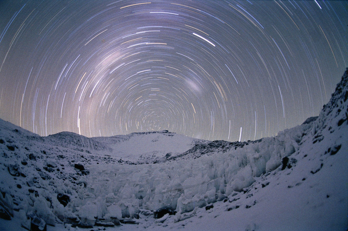 Explanation: In myth, Atlas holds up the heavens, but in this stunning view a mountain appears to serve as the southern night sky pivots around a snowy peak. Recorded during a climbing expedition at an altitude above 19,000 feet (temperature -18 degrees C), the picture places the South Celestial Pole over the Andes mountain Ojos del Salado. Topping out at over 22,000 feet, the Ojos del Salado is a stratovolcano, the highest active volcano on planet Earth. The time exposure lasted an hour and a half, recording the graceful arcing star trails along with the rising Milky Way (left) and setting Magellanic clouds.