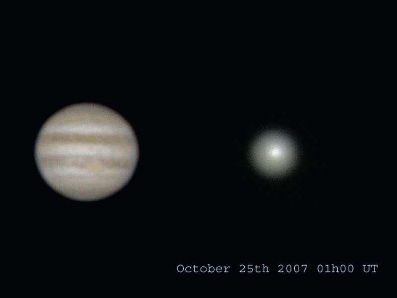 Explanation: Go outside tonight and see Comet Holmes. No binoculars or telescopes are needed -- just curiosity and a sky map. Last week, Comet 17P/Holmes underwent an unusual outburst that vaulted it unexpectedly from obscurity into one of the brightest comets in recent years. Sky enthusiasts from the northern hemisphere have been following the comet's progress closely. In this animation recorded from Quebec, Canada, the coma of Comet Holmes is seen noticeably expanding over the past few days. Jupiter has been placed artificially nearby to allow for a comparison of angular sizes and scaled to the size it would appear at the current location of Comet Holmes. How Comet Holmes will further evolve is unknown, with one possibility being that the expanding gas cloud that started from its recent outburst will slowly disperse and fade.