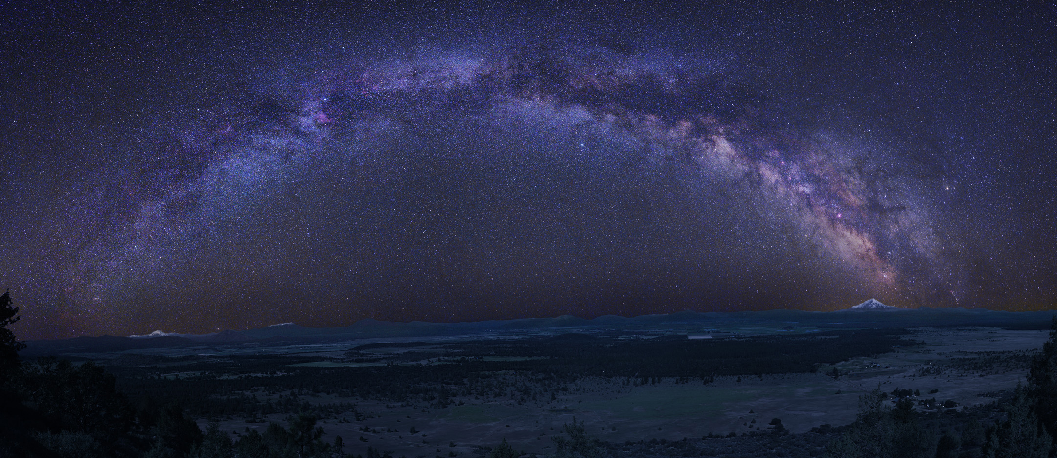 Explanation: The graceful arc of the Milky Way begins and ends at two mountain peaks in this solemn night sky panorama. The view was created from a 24 frame mosaic, with exposures tracking Earth and sky separately. In the final composition, northern California's Mount Lassen was positioned at the left and Mount Shasta at the far right, just below the star and dust clouds of the galactic centre. Lassen and Shasta are volcanoes in the Cascade Mountain Range of North America, an arc of the volcanic Pacific Ring of Fire. In the dim, snow-capped peaks, planet Earth seems to echo the subtle glow of the Milky Way's own faint, unresolved starlight.