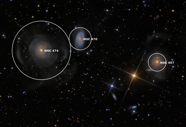 Explanation: This colourful cosmic skyscape features a peculiar system of galaxies catalogued as Arp 227 some 100 million light-years distant. Swimming within the boundaries of the constellation Pisces, Arp 227 consists of the two galaxies prominent on the left; the curious shell galaxy NGC 474 and its blue, spiral-armed neighbour NGC 470. The faint, wide arcs or shells of NGC 474 could have been formed by a gravitational encounter with neighbour NGC 470. Alternately the shells could be caused by a merger with a smaller galaxy producing an effect analogous to ripples across the surface of a pond. Remarkably, the large galaxy on the right hand side of the deep image, NGC 467, appears to be surrounded by faint shells too, evidence of another interacting galaxy system. Intriguing background galaxies are scattered around the field that also includes spiky foreground stars. Of course, those stars lie well within our own Milky Way Galaxy. The field of view spans 25 arc minutes or about 1/2 degree on the sky.