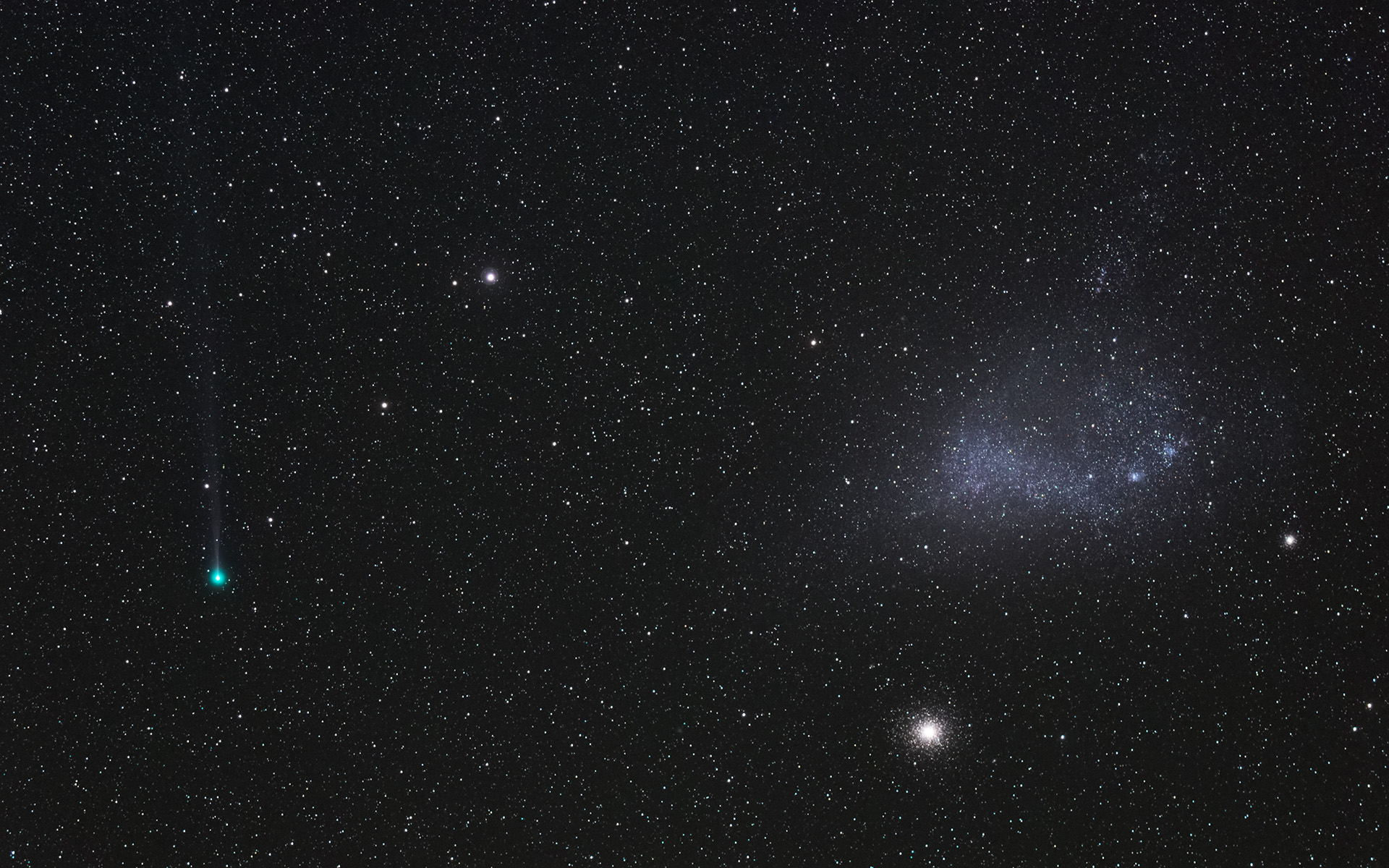 Explanation: For now, Comet Lemmon (C/2012 F6a), and Comet PanSTARRS (C/2011 L4) are sweeping through southern skies. Lemmon's lime green coma and thin tail are near the left edge of this telephoto scene, a single frame from a timelapse video (vimeo here) recorded on February 12, tracking its motion against the background stars. Comet Lemmon's path brought it close to the line-of-sight to prominent southern sky treasures the Small Magellanic Cloud and globular cluster 47 Tucanae (right). Sporting a broader, whitish tail, Comet PanSTARRS appears in later video frames moving through the faint constellation Microscopium. Visible in binoculars and small telescopes, both comets are getting brighter and headed toward northern skies in coming months.