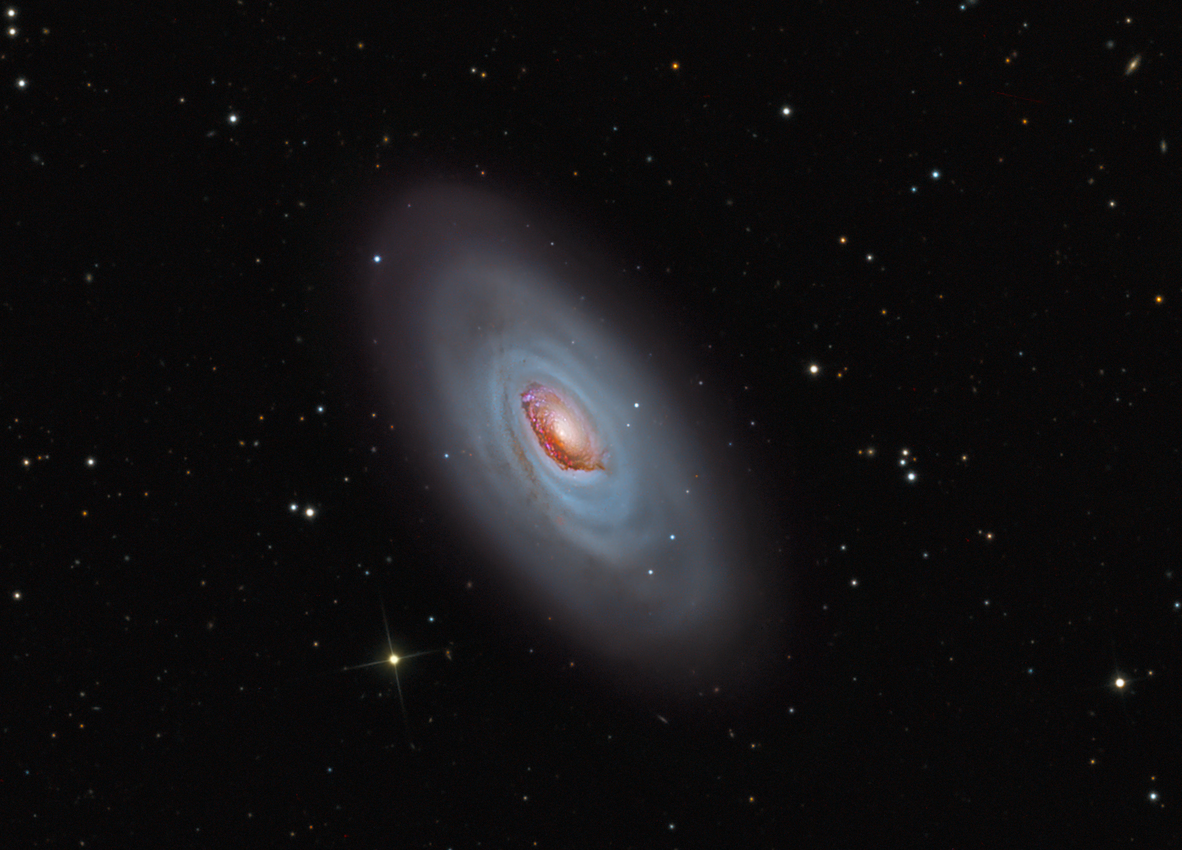 Explanation: This beautiful, bright, spiral galaxy is Messier 64, often called the Black Eye Galaxy or the Sleeping Beauty Galaxy for its heavy-lidded appearance in telescopic views. M64 is about 17 million light-years distant in the otherwise well-groomed northern constellation Coma Berenices. In fact, the Red Eye Galaxy might also be an appropriate moniker in this colourful composition of narrow and wideband images. The enormous dust clouds obscuring the near-side of M64's central region are laced with the telltale reddish glow of hydrogen associated with star forming regions. But they are not this galaxy's only peculiar feature. Observations show that M64 is actually composed of two concentric, counter-rotating systems of stars, one in the inner 3,000 light-years and another extending to about 40,000 light-years and rotating in the opposite direction. The dusty eye and bizarre rotation is likely the result of a billion year old merger of two different galaxies.