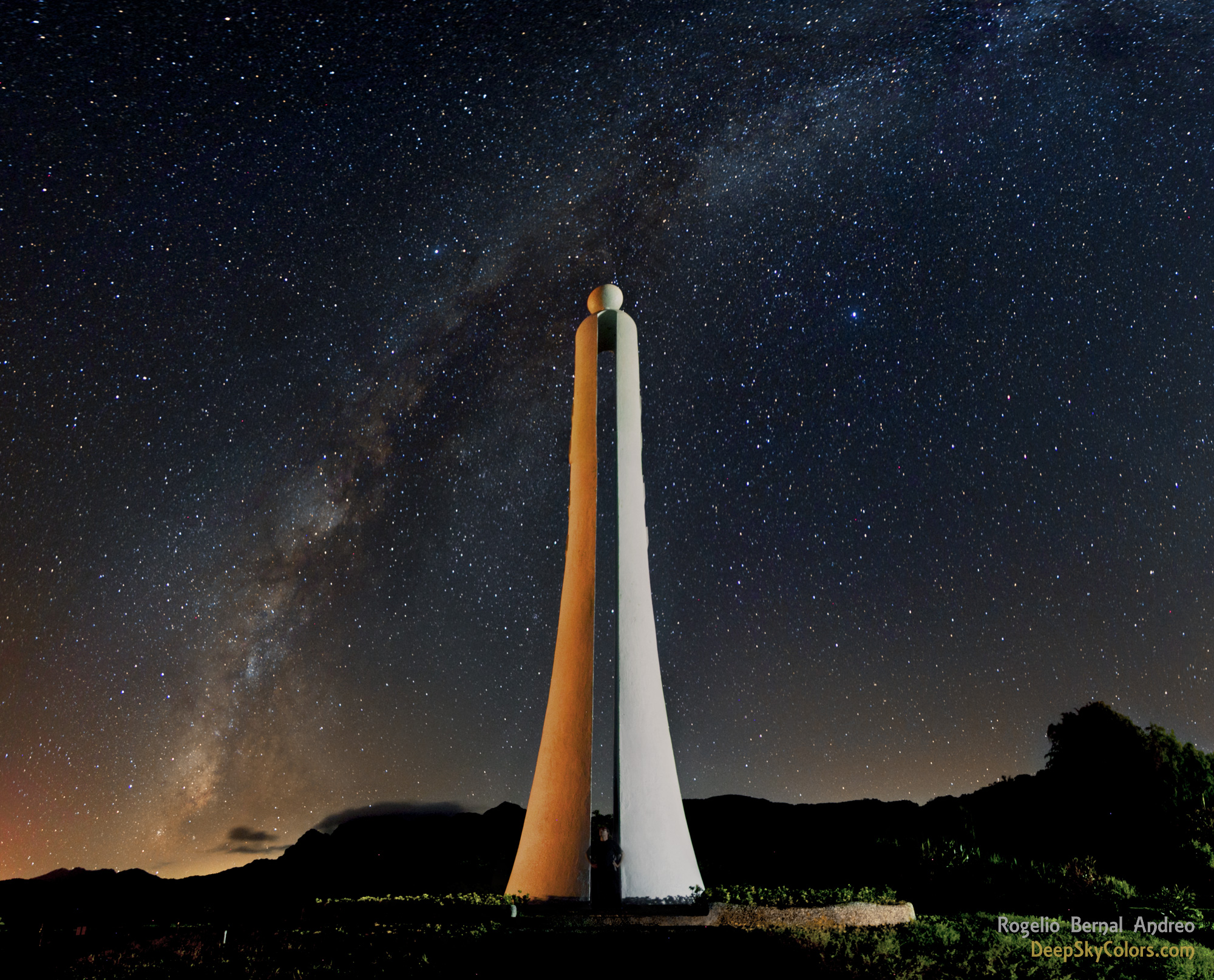 Explanation: This intriguing monument can be found in Taiwan between the cities of Hualian and Taitong. Split into two sides, it straddles a special circle of latitude on planet Earth, near 23.5 degrees north, known as the Tropic of Cancer. Points along the Tropic of Cancer are the northernmost locations where the Sun can pass directly overhead, an event that occurs once a year during the northern hemisphere's summer solstice. The latitude that defines the Tropic of Cancer corresponds to the tilt of planet Earth's rotation axis with respect to its orbital plane. The name refers to the zodiacal constellation Cancer the Crab. Historically the Sun's position was within Cancer during the northern summer solstice, but because of the precession of Earth's axis, that solstice Sun is currently within the boundaries of Taurus. In this starry night scene the otherwise all white structure is coloured by city lights, with its orange side just south of the Tropic of Cancer and the white side just north. Of course, there is a southern hemisphere counterpart of the Tropic of Cancer. It's called the Tropic of Capricorn.
