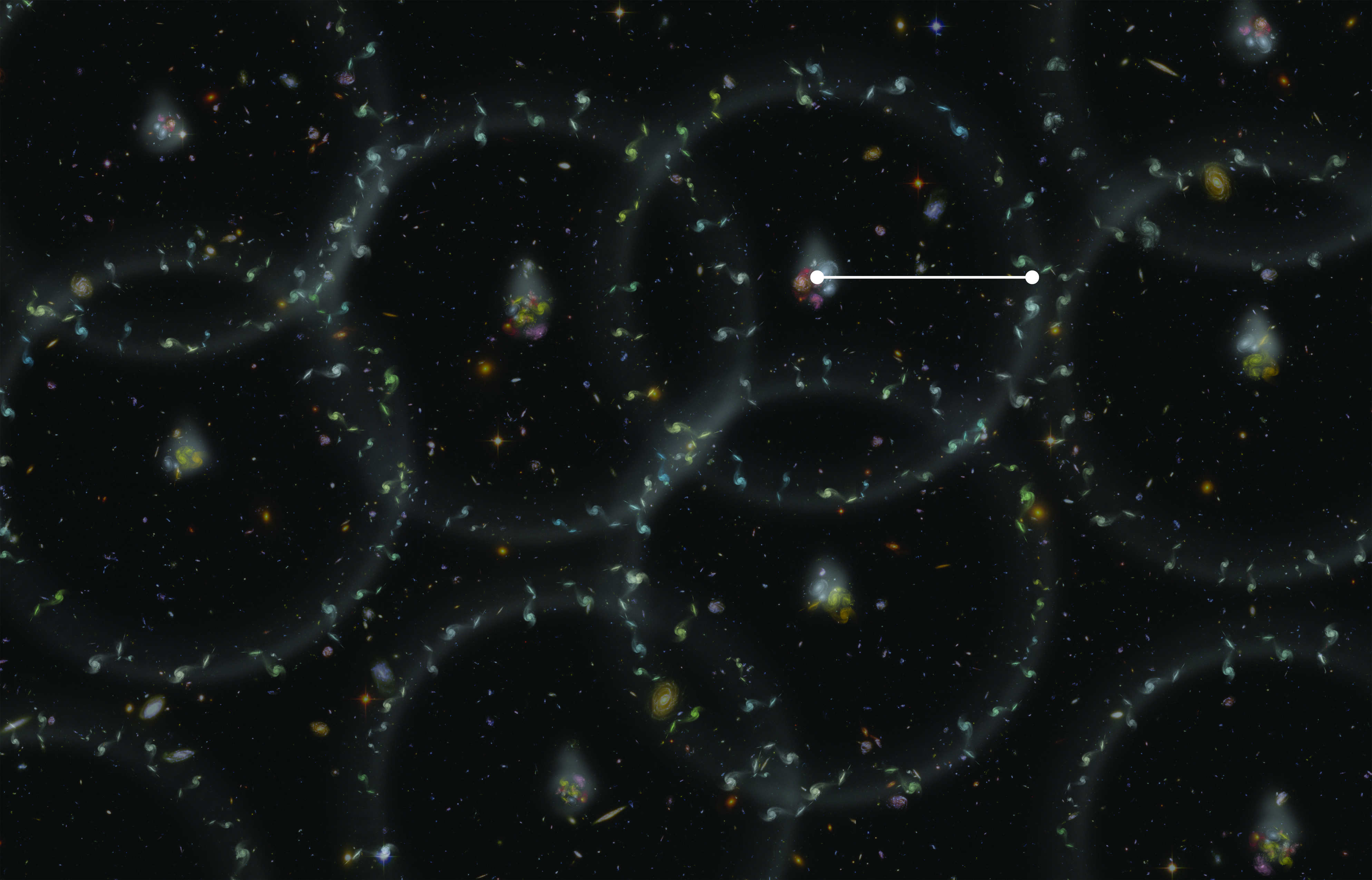 Explanation: How large do things appear when far away? When peering across the universe, the answer can actually tell us about its average gravitational history and hence its composition. Toward this goal, the Baryon Oscillation Spectroscopic Survey (BOSS) of the Sloan Digital Sky Survey-III (SDSS-III) has measured slight recurring density enhancements in galaxy densities up to six billion light years away (redshift 0.7), when the universe was about half its current age. These density ripples are known as baryon acoustic oscillations (BAOs) and are expected to emerge from the early universe at a known size scale. BOSS's measurements of this size scale indicate a strong universe component of dark energy, and so bolsters previous indications of this unusual composition. Pictured above is an artist's illustration depicting exaggerated BAOs in the distant universe.