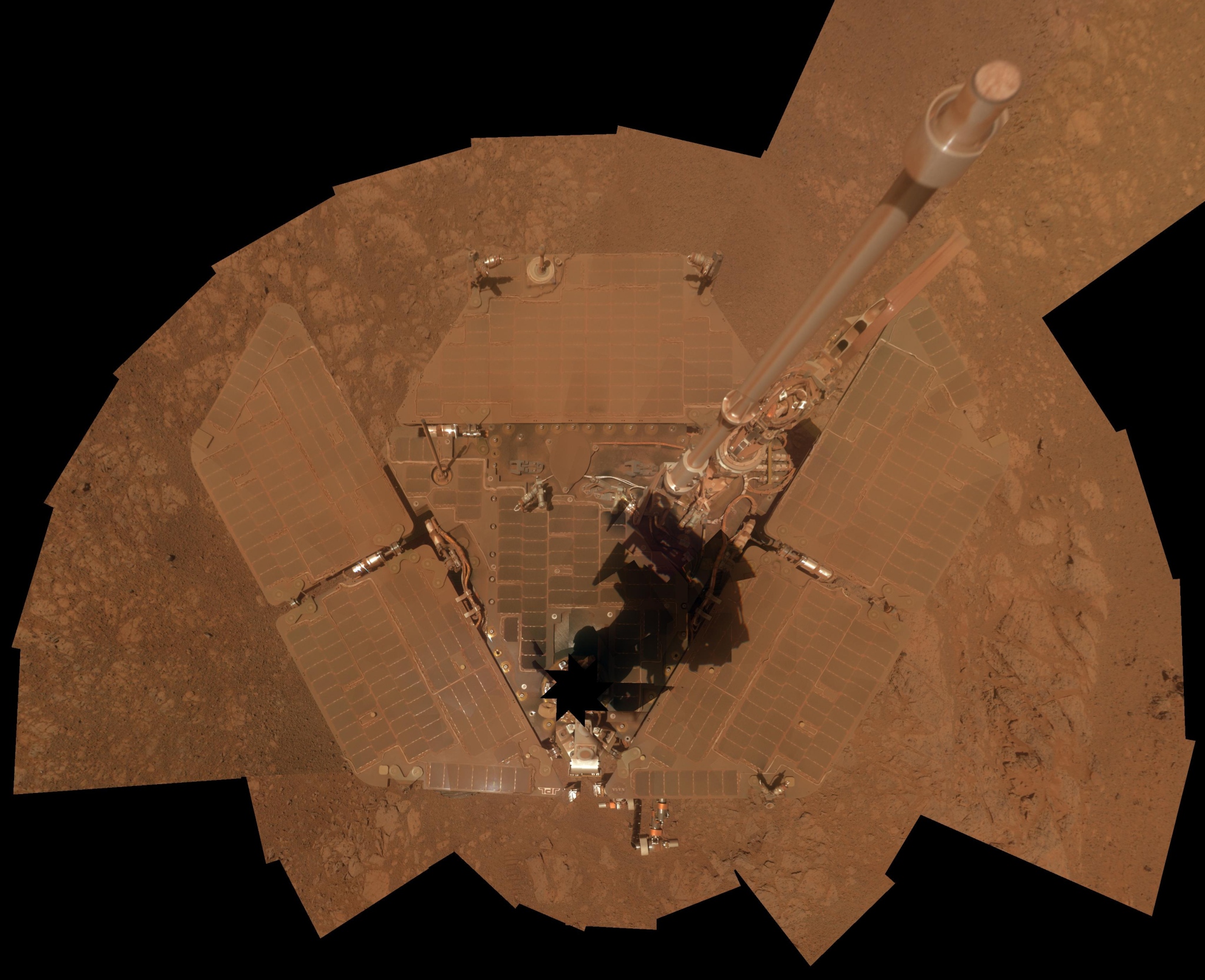 Explanation: On January 25 (UT) 2004, the Opportunity rover fell to Mars, making today the 10th anniversary of its landing. After more than 3,500 sols (Mars solar days) the golf cart-sized robot from Earth is still actively exploring the Red Planet, though its original mission plan was for three months. This self-portrait was made with Opportunity's panoramic camera earlier this month. The camera's supporting mast has been edited out of the image mosaic but its shadow is visible on the dusty solar panels arrayed across the rover's deck. For comparison, a similar self-portrait from late 2004 is shown in the inset. Having driven some 39 kilometres (24 miles) from its landing site, Opportunity now rests at Solander Point at the rim of Endeavour Crater.