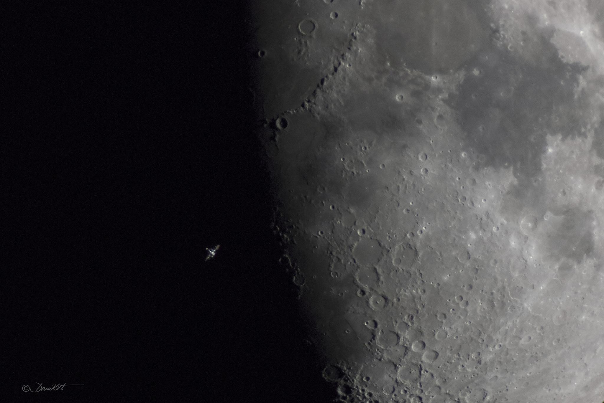 Explanation: What's that in front of the Moon? It's the International Space Station. Using precise timing, the Earth-orbiting space platform was photographed in front of a partially lit Moon last year. The featured image was taken from Madrid, Spain with an exposure time of only 1/1000 of a second. In contrast, the duration of the transit of the ISS across the entire Moon was about half a second. The sun-glinting station can be seen just to the dark side of the day / night line known as the terminator. Numerous circular craters are visible on the distant Moon, as well as comparatively rough, light coloured terrain known as highlands, and relatively smooth, dark coloured areas known as maria. On-line tools can tell you when the International Space Station will be visible from your area.