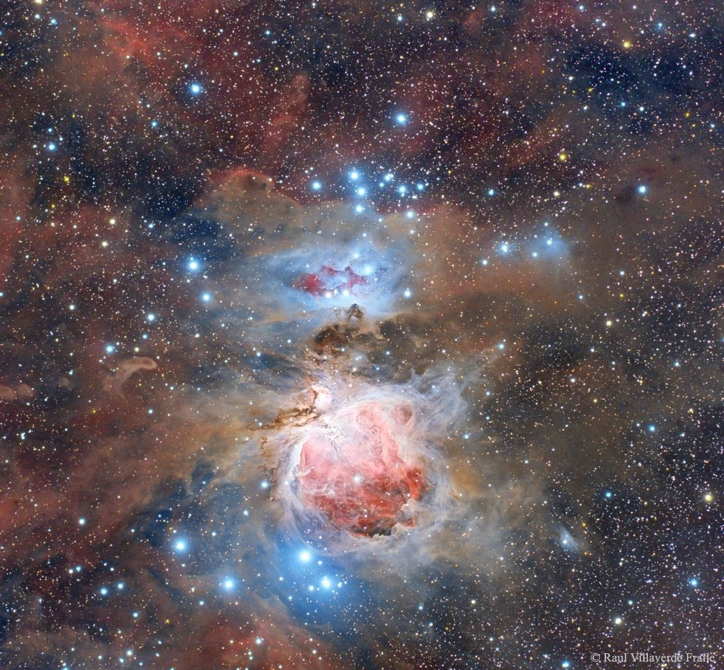 Explanation: What surrounds a hotbed of star formation? In the case of the Orion Nebula -- dust. The entire Orion field, located about 1600 light years away, is inundated with intricate and picturesque filaments of dust. Opaque to visible light, dust is created in the outer atmosphere of massive cool stars and expelled by a strong outer wind of particles. The Trapezium and other forming star clusters are embedded in the nebula. The intricate filaments of dust surrounding M42 and M43 appear brown in the featured image, while central glowing gas is highlighted in red. Over the next few million years much of Orion's dust will be slowly destroyed by the very stars now being formed, or dispersed into the Galaxy.