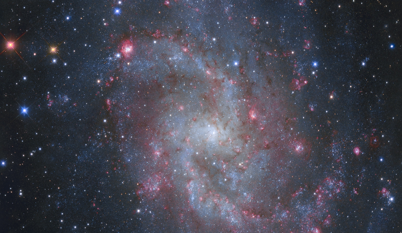 Explanation: Gorgeous spiral galaxy M33 seems to have more than its fair share of glowing hydrogen gas. A prominent member of the local group of galaxies, M33 is also known as the Triangulum Galaxy and lies about 3 million light-years distant. The galaxy's inner 30,000 light-years or so are shown in this telescopic portrait that enhances its reddish ionized hydrogen clouds or HII regions. Sprawling along loose spiral arms that wind toward the core, M33's giant HII regions are some of the largest known stellar nurseries, sites of the formation of short-lived but very massive stars. Intense ultraviolet radiation from the luminous, massive stars ionizes the surrounding hydrogen gas and ultimately produces the characteristic red glow. To enhance this image, broadband data was used to produce a colour view of the galaxy and combined with narrowband data recorded through a hydrogen-alpha filter. That filter transmits the light of the strongest visible hydrogen emission line.