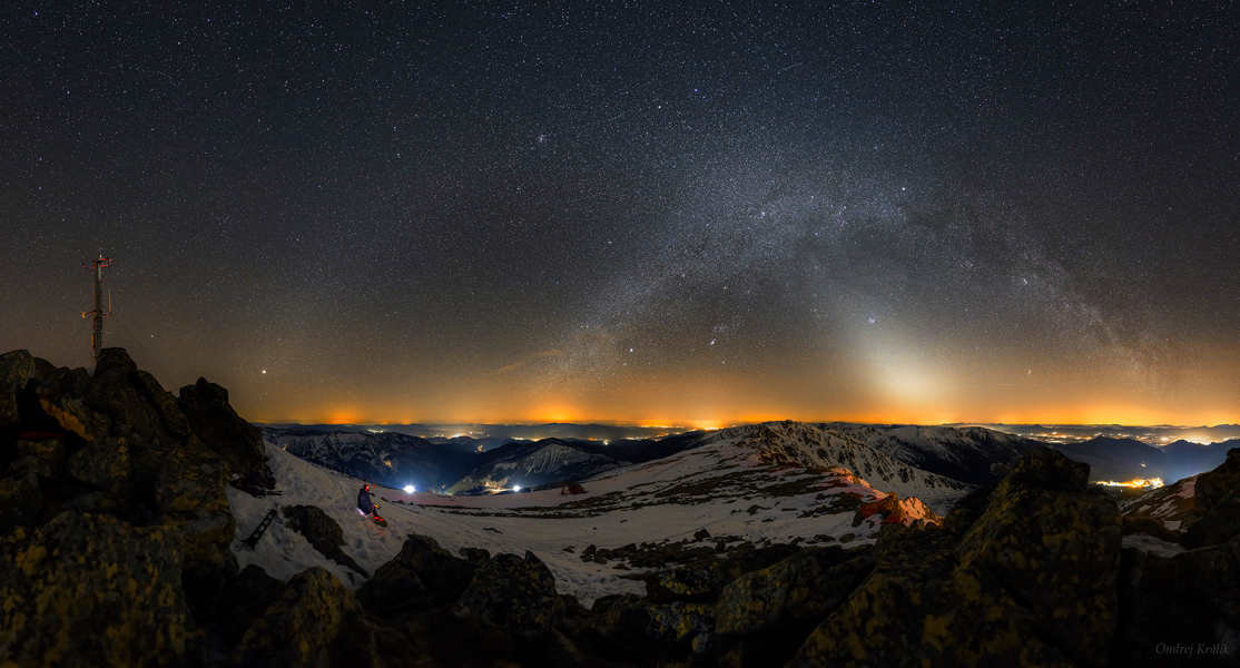 Explanation: Two luminous arches stretched across the dome of the sky on this northern spring night. After sunset on March 29, the mountain view panorama was captured in 57 exposures from Chopok peak in central Slovakia at an altitude of about 2,000 metres. The arc of the northern Milky Way is visible toward the right, but only after it reaches above the terrestrial lights from the mountain top perspective. Though dusk has passed, a bright patch of celestial light still hovers near the horizon and fades into a second luminous arch of Zodiacal Light, crossing near the centre of the Milky Way. Dust in the ecliptic plane reflects sunlight to create the Zodiacal glow, typically prominent after sunset in clear, dark, skies of the northern spring. Almost opposite the Sun, Jupiter shines brightly near the horizon toward the left. Since Jupiter lies near the ecliptic, it appears within the slight brightening of the Zodiacal band also opposite the Sun called the Gegenschein.