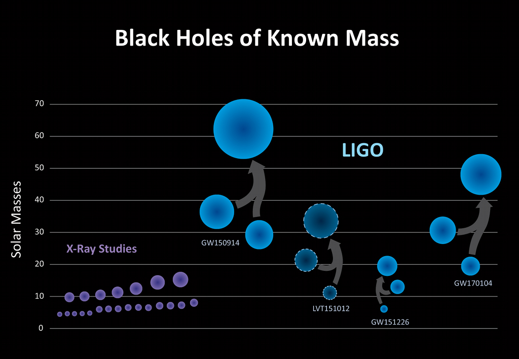Explanation: Add GW170104 to the chart of black holes with known mass. The extremely energetic merger of two smaller black holes corresponds to the Laser Interferometer Gravitational-wave Observatory's (LIGO) third detection of gravitational waves. The newfound black hole has a mass about 49 times that of the Sun, filling a gap between the masses of the two merged black holes detected previously by LIGO, with solar masses of 62 (GW150914) and 21 (GW151226). In all three cases, the signal in each of the twin LIGO detectors was unambiguously identified as coming from black hole mergers while a fourth case (LVT151012) resulted in a lower confidence detection. GW170104 is estimated to be some 3 billion light-years away, more distant than present estimates for GW150914 and GW151226. The ripples in spacetime were discovered during LIGO's current observing run, which began November 30, 2016 and will continue through the summer.