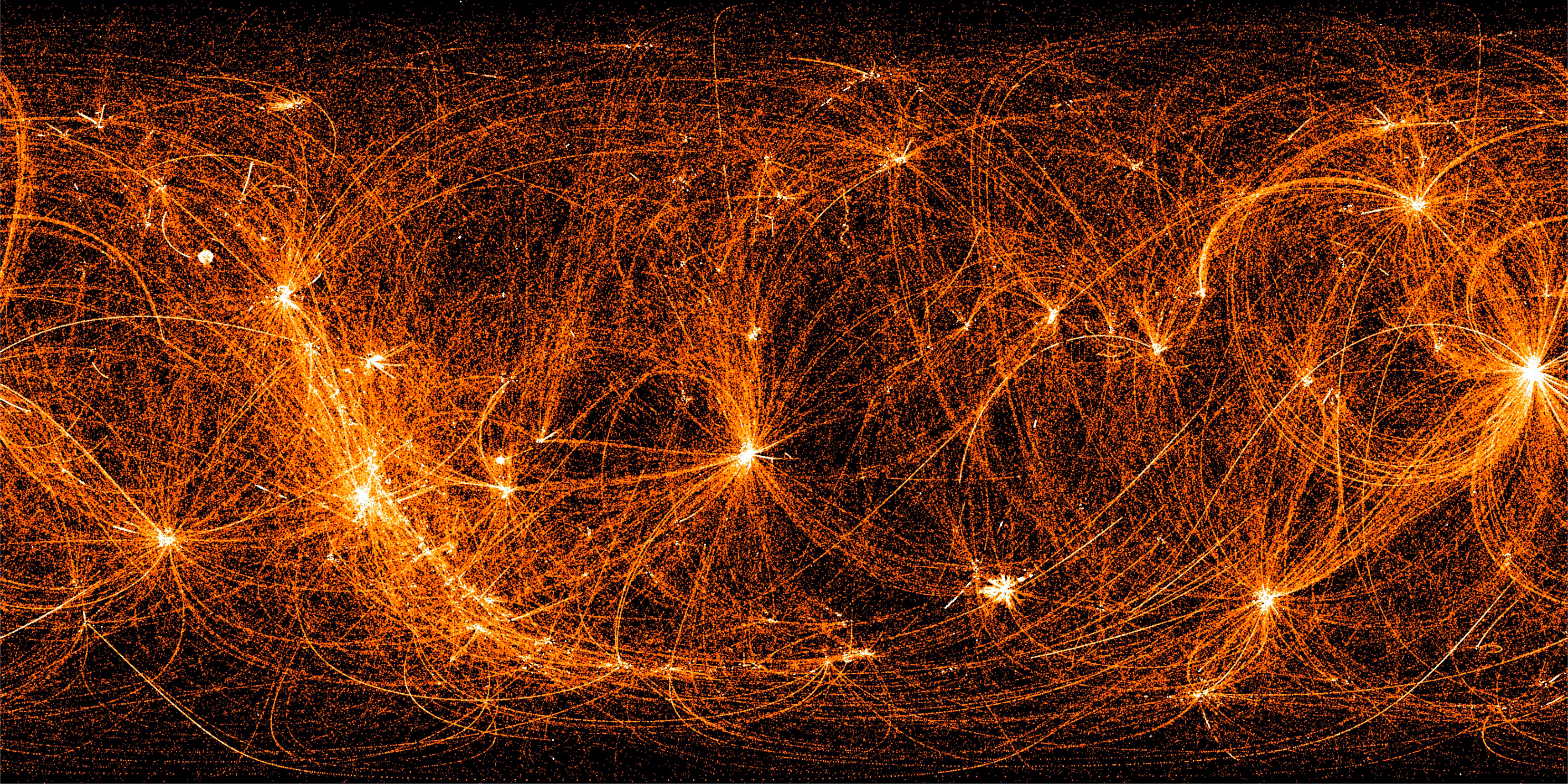 Explanation: A payload on board the International Space Station, the Neutron star Interior Composition Explorer (NICER) twists and turns to track cosmic sources of X-rays as the station orbits planet Earth every 93 minutes. During orbit nighttime, its X-ray detectors remain on. So as NICER slews from target to target bright arcs and loops are traced across this all-sky map made from 22 months of NICER data. The arcs tend to converge on prominent bright spots, pulsars in the X-ray sky that NICER regularly targets and monitors. The pulsars are spinning neutron stars that emit clock-like pulses of X-rays. Their timing is so precise it can be used for navigation, determining spacecraft speed and position. This NICER X-ray, all-sky, map is composed in coordinates with the celestial equator horizontally across the centre.