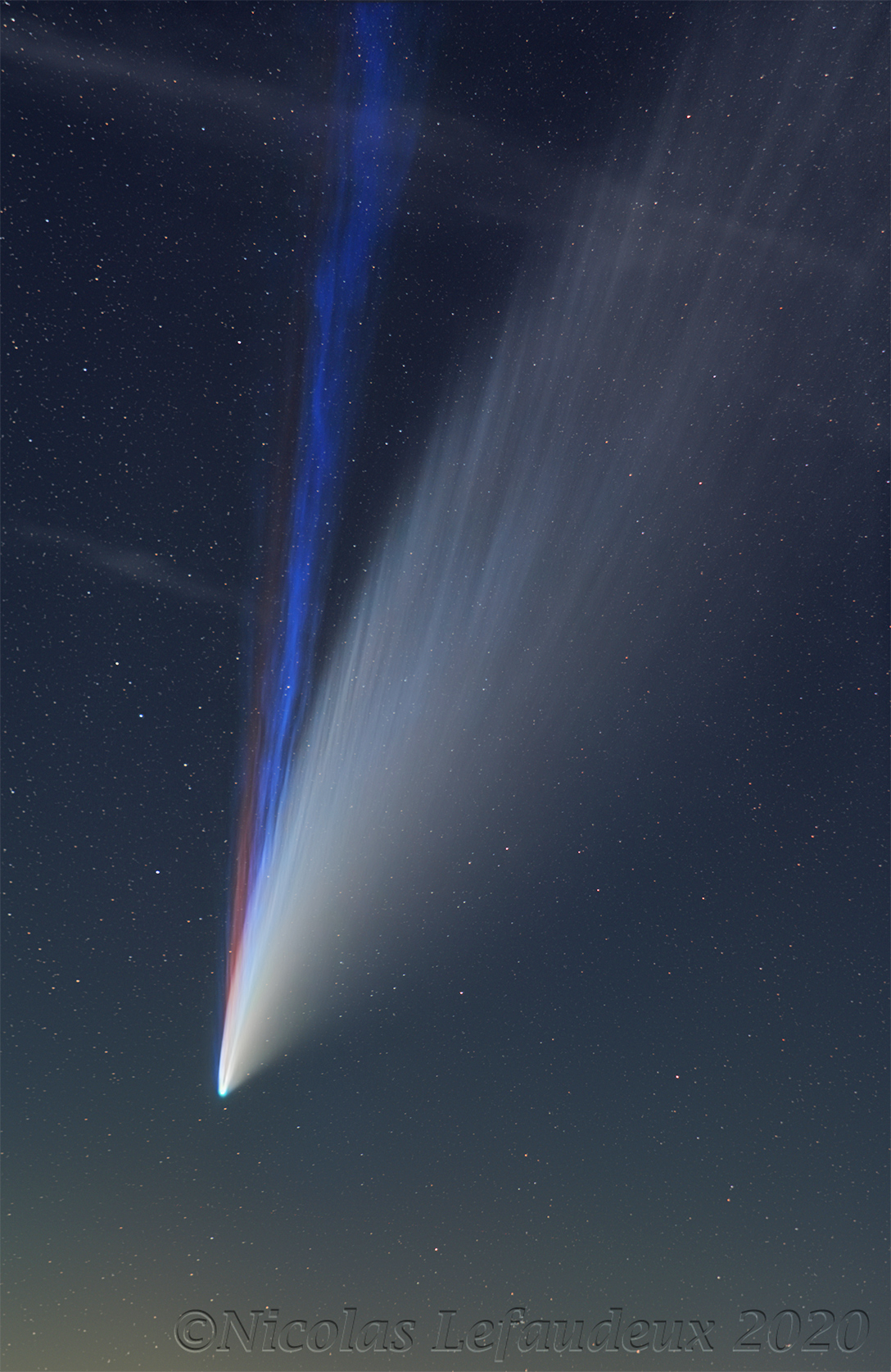 Explanation: What created the unusual red tail in Comet NEOWISE? Sodium. A spectacular sight back in the summer of 2020, Comet NEOWISE, at times, displayed something more than just a surprisingly striated white dust tail and a pleasingly patchy blue ion tail. Some colour sensitive images showed an unusual red tail, and analysis showed much of this third tail's colour was emitted by sodium. Gas rich in sodium atoms might have been liberated from Comet NEOWISE's warming nucleus in early July by bright sunlight, electrically charged by ultraviolet sunlight, and then pushed out by the solar wind. The featured image was captured in mid-July from Brittany, France and shows the real colours. Sodium comet tails have been seen before but are rare -- this one disappeared by late July. Comet C/2020 F3 (NEOWISE) has since faded, lost all of its bright tails, and now approaches the orbit of Jupiter as it heads back to the outer Solar System, to return only in about 7,000 years.