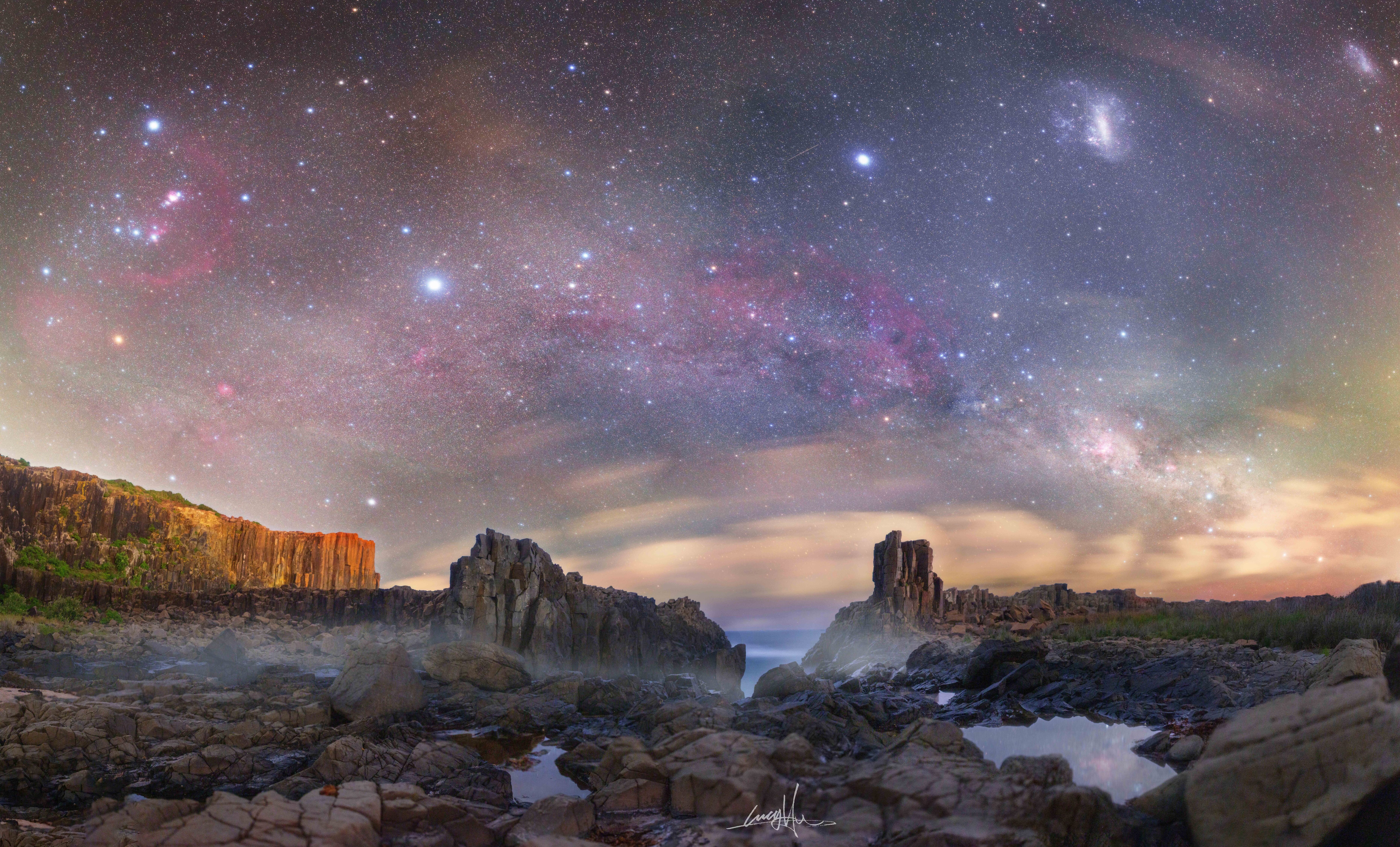 Explanation: This is a sky filled with glowing icons. On the far left is the familiar constellation of Orion, divided by its iconic three-aligned belt stars and featuring the famous Orion Nebula, both partly encircled by Barnard's Loop. Just left of centre in the featured image is the brightest star in the night: Sirius. Arching across the image centre is the central band of our Milky Way Galaxy. On the far right, near the top, are the two brightest satellite galaxies of the Milky Way: the Large Magellanic Cloud (LMC), and the Small Magellanic Cloud (SMC). Also on the far right -- just above the cloudy horizon -- is the constellation of Crux, complete with the four stars that make the iconic Southern Cross. The featured image is a composite of 18 consecutive exposures taken by the same camera and from the same location in eastern Australia during the last days of last year. In the foreground, picturesque basalt columns of the Bombo Quarry part to reveal the vast Pacific Ocean.
