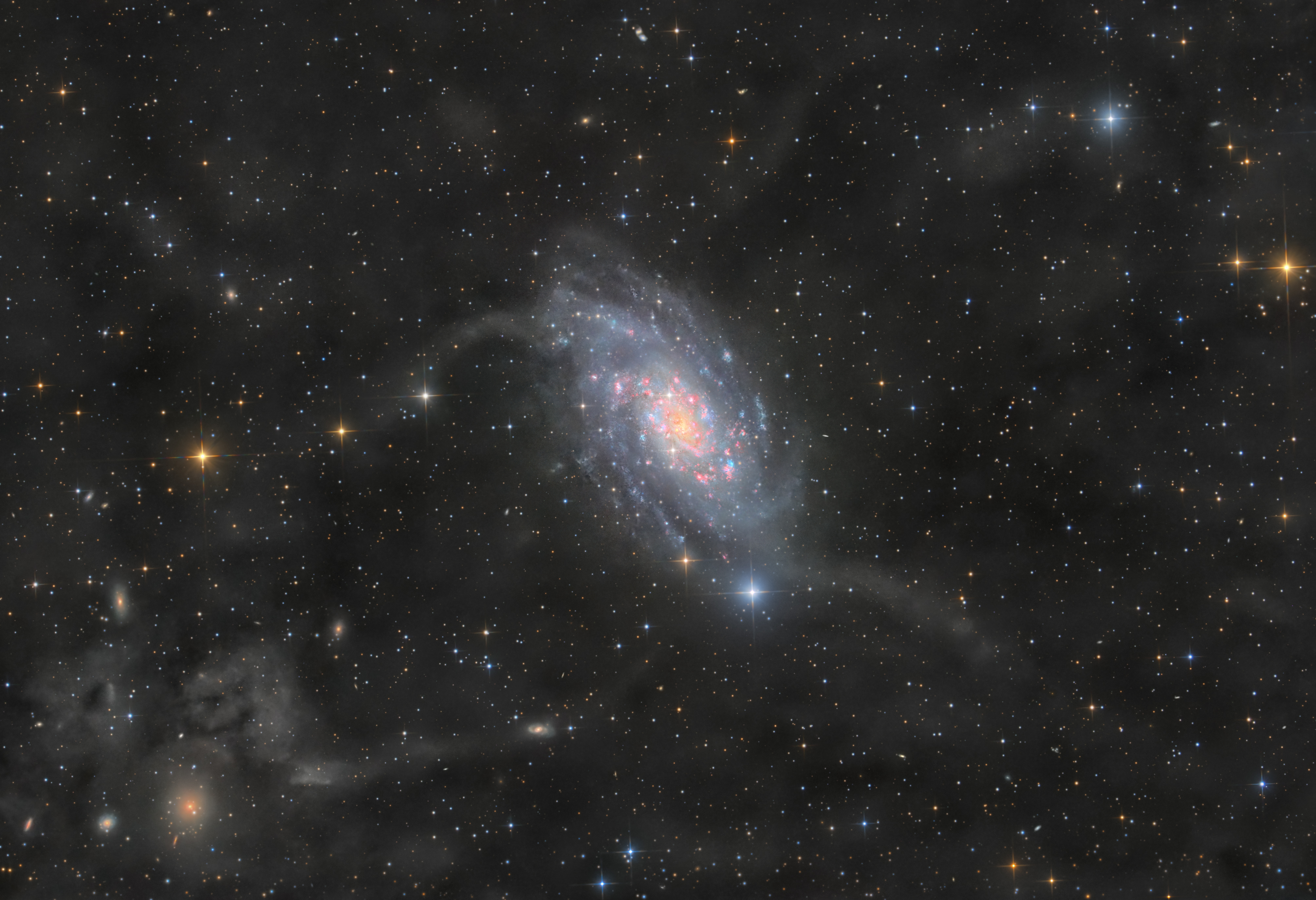 Explanation: Magnificent island universe NGC 2403 stands within the boundaries of the long-necked constellation Camelopardalis. Some 10 million light-years distant and about 50,000 light-years across, the spiral galaxy also seems to have more than its fair share of giant star forming HII regions, marked by the telltale reddish glow of atomic hydrogen gas. The giant HII regions are energized by clusters of hot, massive stars that explode as bright supernovae at the end of their short and furious lives. A member of the M81 group of galaxies, NGC 2403 closely resembles a galaxy in our own local galaxy group with an abundance of star forming regions, M33, the Triangulum Galaxy. Spiky in appearance, bright stars in this portrait of NGC 2403 are in the foreground, within our own Milky Way. Also in the foreground of the deep, wide-field, telescopic image are the Milky Way's dim and dusty interstellar clouds also known as galactic cirrus or integrated flux nebulae. But faint features that seem to extend from NGC 2403 itself are likely tidal stellar streams drawn out by gravitational interactions with neighbouring galaxies.