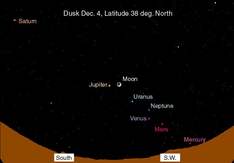 Explanation: Look up tonight. Just after sunset, the crescent moon and all five "naked-eye" planets (Mercury, Venus, Mars, Jupiter, and Saturn) will be visible (depending on your latitude), lying near our solar system's ecliptic plane. Venus and Jupiter will shine brilliantly as the brightest "stars" in the sky, but Mercury will be near the horizon and hard to see. A pair of binoculars will also reveal Uranus and Neptune and observers with a telescope and a good site may even be able to glimpse faint Pluto just above the Western horizon in the fading twilight (not shown on the chart above). Enjoy this lovely spectacle any clear night through about December 8. A similar gathering is expected in May 2000 but the planets will be hidden from view by the solar glare. A night sky as full of planets as this one will occur again though ... in about 100 years.