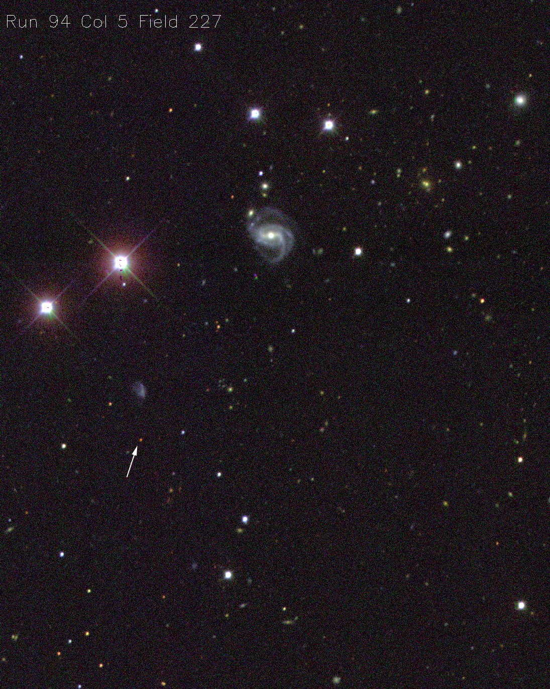 Explanation: Each red speck indicated above is a powerful quasar estimated to be over 100 times brighter than a galaxy. Yet in these Sloan Digital Sky Survey discovery images the quasars appear faint because they are extremely distant. Their distances have been indirectly gauged by noting how much the light they emit has been stretched to longer wavelengths by the expansion of the Universe. Because red light has the longest wavelengths in the visible spectrum, this stretch has come to be called "redshift" - the greater the distance, the greater the redshift. Astronomers use a number known as "Z" to quantify this cosmological redshift and the quasar at the left, with a Z of 5, was just proclaimed the new quasar redshift champion (from left to right the measured Zs are 5.00, 4.90, 4.75). What's the actual distance to quasars with Zs of 5 or so? ... about 15 billion light-years, give or take a few billion light-years depending on your favourite cosmology!