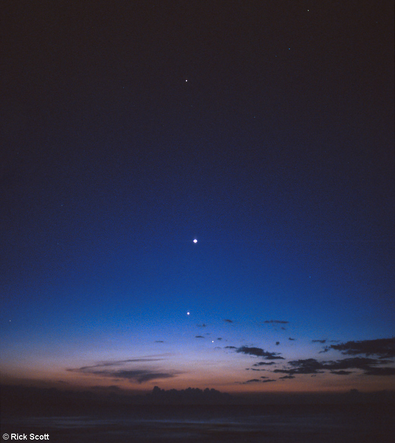 Explanation: This March stargazers have been treated to eye-catching formations of bright planets in western evening skies. On March 3rd, looking toward a beautiful sunset from a beach on the Hawaiian isle of Maui, photographer Rick Scott recorded this fleeting, four-planet "hockey stick" array. Mercury, closest to the horizon and immersed in fading sunlight, is easily visible between silhouetted clouds. To the left and up in the deepening blue is Jupiter with a brilliant Venus above and Saturn shining in the darkened sky near the top of the image. The planets are seen to lie close to the ecliptic - the apparent path of the sun - which is nearly perpendicular to the horizon for Hawaiian latitudes at this time of year.