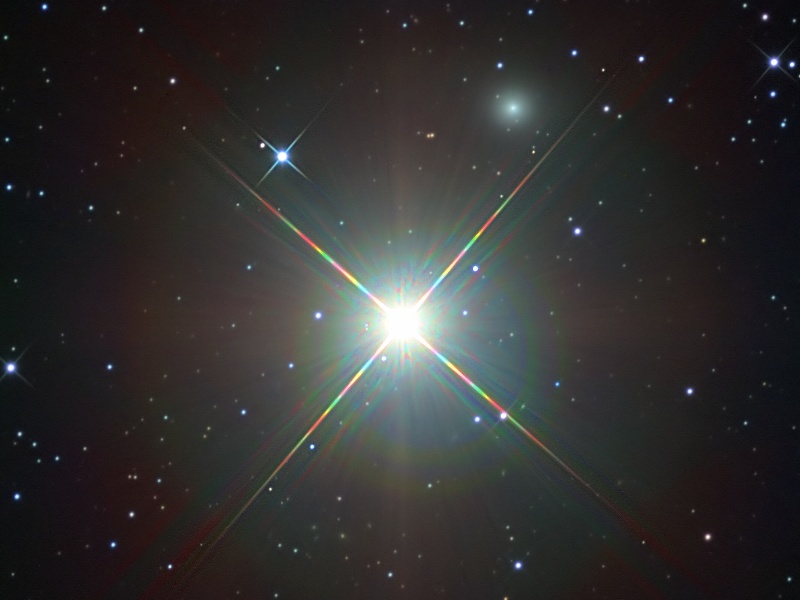 Explanation: As far as ghosts go, Mirach's Ghost isn't really that scary. In fact, Mirach's Ghost is just a faint, fuzzy galaxy, well known to astronomers, that happens to be seen nearly along the line-of-sight to Mirach, a bright star. Centred in this star field, Mirach is also called Beta Andromedae. About 200 light-years distant, Mirach is a red giant star, cooler than the Sun but much larger and so intrinsically much brighter than our parent star. In most telescopic views, glare and diffraction spikes tend to hide things that lie near Mirach and make the faint, fuzzy galaxy look like a ghostly internal reflection of the almost overwhelming starlight. Still, appearing in this sharp image just above and to the right of Mirach, Mirach's Ghost is catalogued as galaxy NGC 404 and is estimated to be some 10 million light-years away.