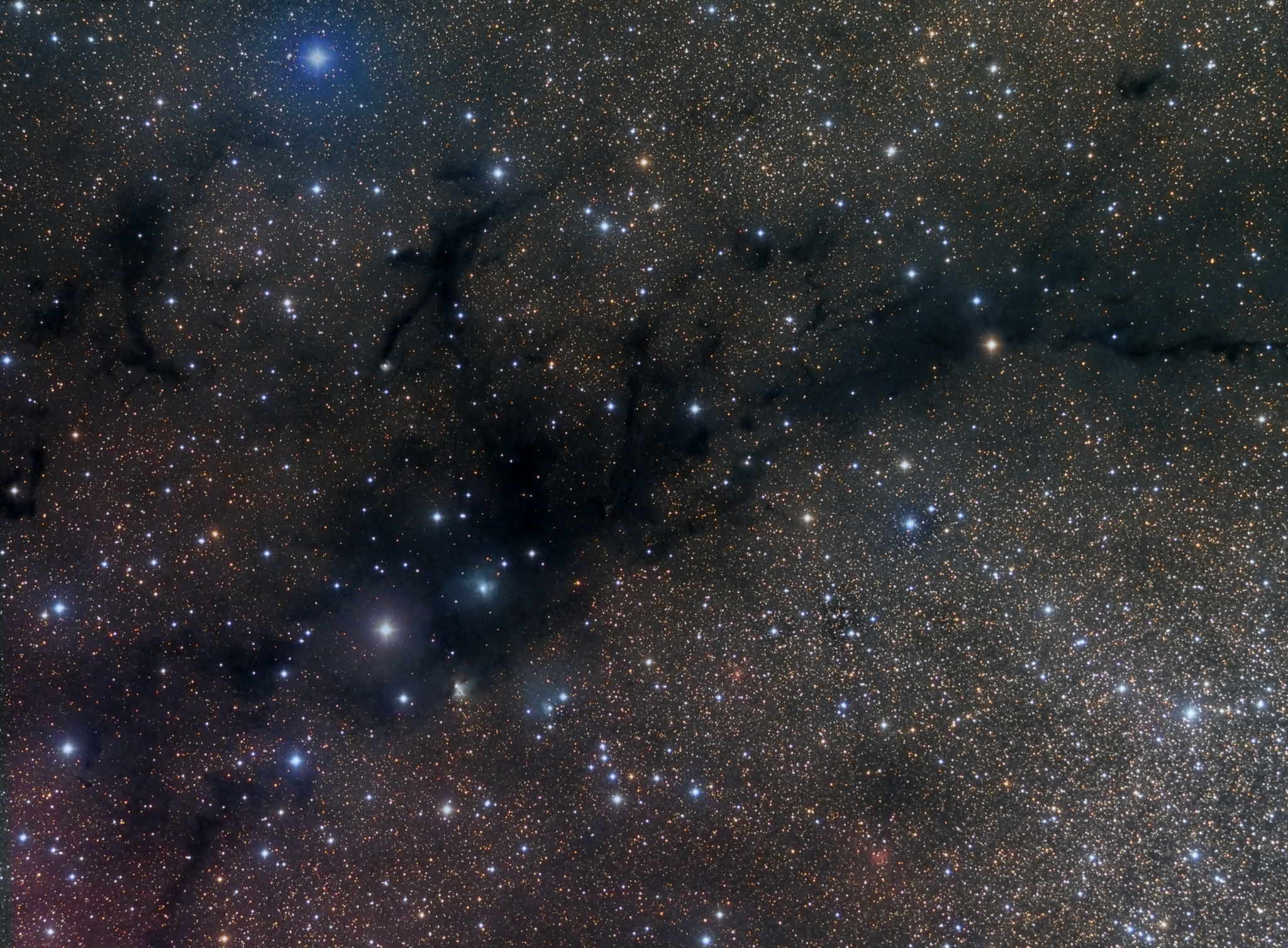 Explanation: Stars are forming in dark, dusty molecular cloud LDN 988. Seen near picture centre some 2,000 light-years distant, LDN 988 and other nearby dark nebulae were catalogued by Beverly T. Lynds in 1962 using Palomar Observatory Sky Survey plates. Narrowband and near-infrared explorations of the dark nebula reveal energetic shocks and outflows light-years across associated with dozens of newborn stars. But in this sharp optical telescopic view, the irregular outlines of LDN 988 and friends look like dancing stick figures eclipsing the rich starfields of the constellation Cygnus. From dark sky sites the region can be identified by eye alone. It's part of the Great Rift of dark nebulae along the plane of the Milky Way galaxy known as the Northern Coalsack.