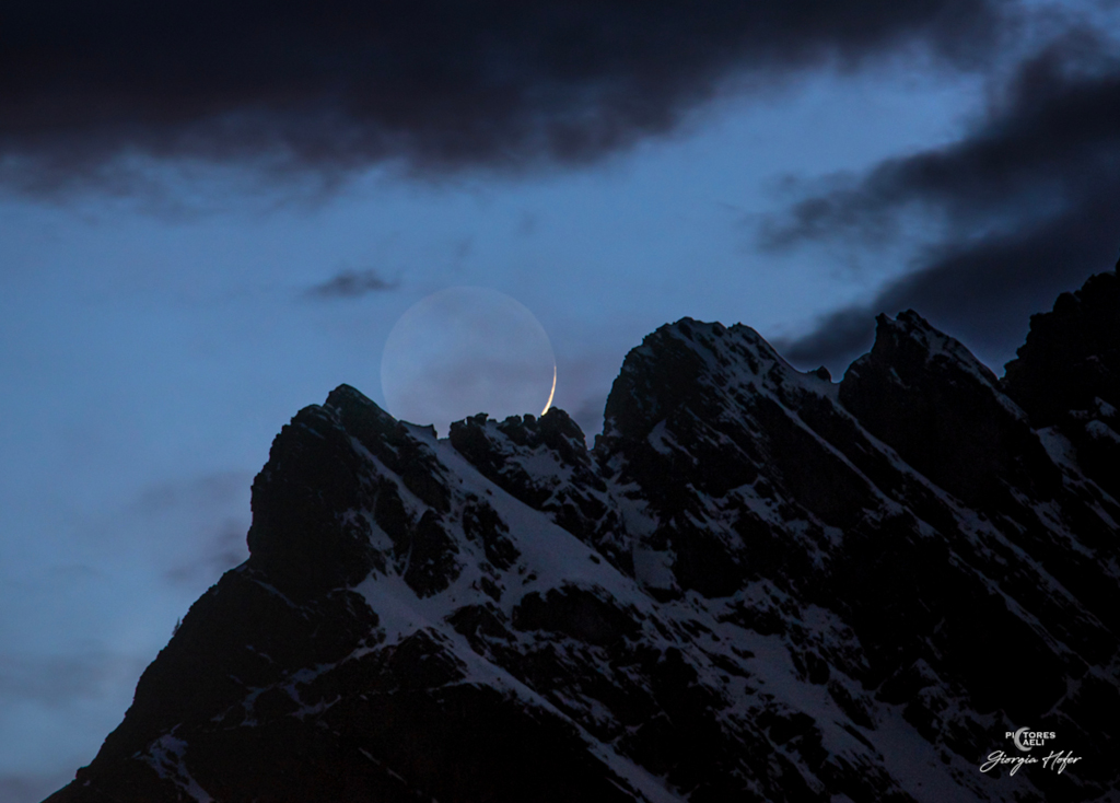 Explanation: A 26 hour old Moon poses behind the craggy outline of the Italian Dolomites in this twilight mountain and skyscape. The one second long exposure was captured near moonset on March 30. And while only a a sliver of its sunlit surface is visible, most of the Moon's disk can be seen by earthshine as light reflected from a bright planet Earth illuminates the lunar nearside. Also known as the Moon's ashen glow, a description of earthshine in terms of sunlight reflected by Earth's oceans illuminating the Moon's dark surface was written over 500 years ago by Leonardo da Vinci. Of course earthshine is just the most familiar example of planetshine, the faint illumination of the dark portion of a moon by light reflected from its planet.