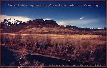 Explanation: Moonlight illuminates the landscape and lends a painterly quality to this beautiful photograph of the Absaroka mountain range, located along the Montana-Wyoming border near the USA's Yellowstone National Park. In the foreground lies the North Fork of the Shoshone River. The snow-covered peak rising 10,500 feet on the left is Jim Mountain, while Comet Hale-Bopp graces the western sky. Inspired by painters of the American West, like Fredric Remington, Charles Russell, and George "Dee" Smith, photographer Dewey Vanderhoff of Cody, Wyoming has taken advantage of the double blessings of a bright Moon and a bright comet to produce this breathtaking image.