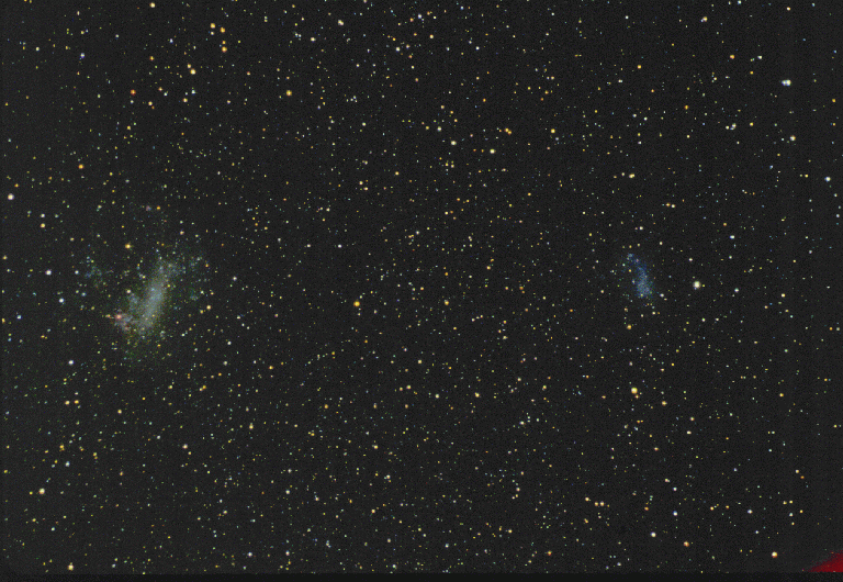 Explanation: Two galaxies stand out to casual observers in Earth's Southern Hemisphere: the Large Magellanic Cloud (LMC) and the Small Magellanic Cloud (SMC). These irregular galaxies are two of the closest galaxies to our Milky Way Galaxy. Recent observations of the LMC (on the left) have determined that it is on a nearly circular orbit around our Galaxy, and have even helped in the determination of the composition of dark matter in our Galaxy. The above photograph spans 40 degrees. Visible on the lower left of the LMC is the Tarantula Nebula (in red). In the foreground to the right of the SMC is globular cluster 47 Tucanae, appearing here as a bright point of light.